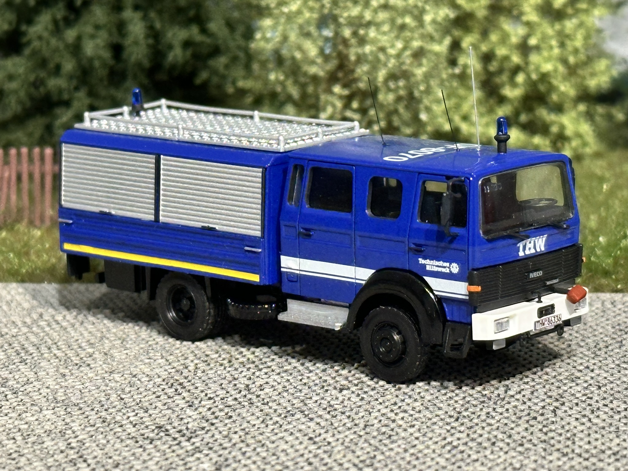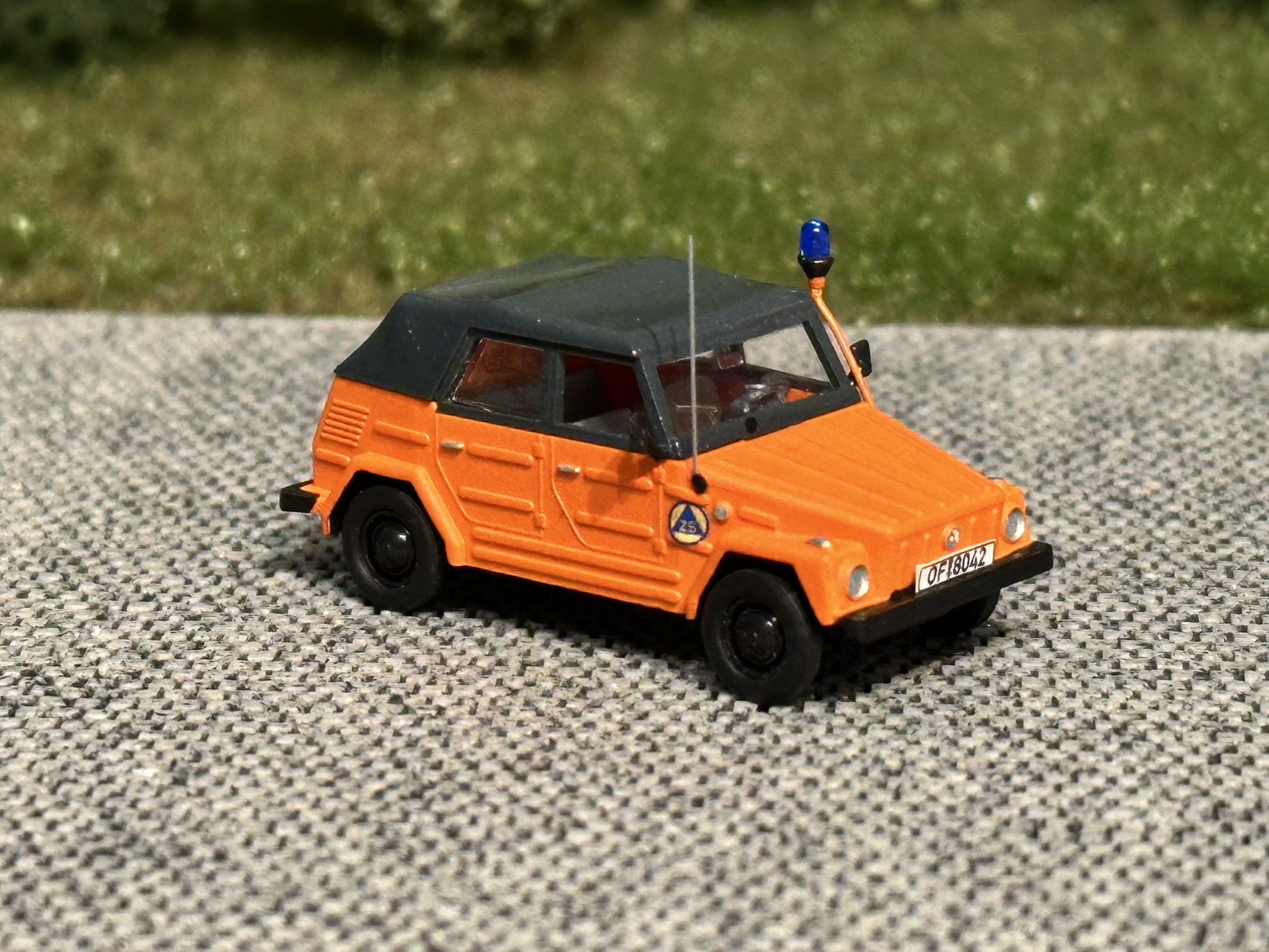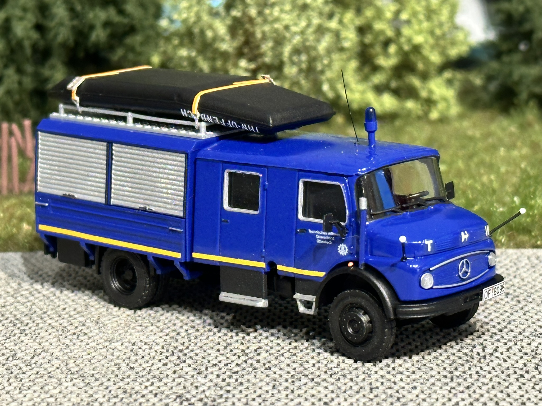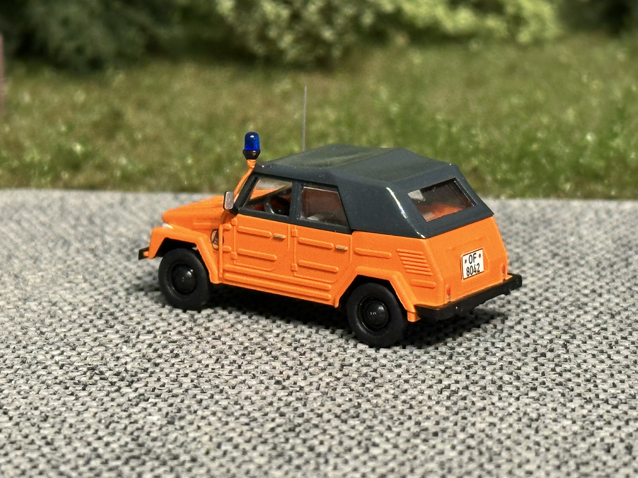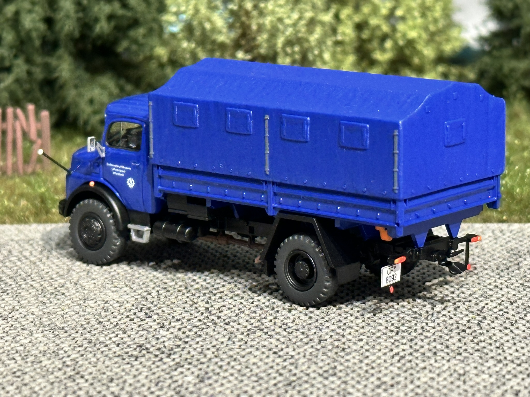 Zum Modell: Es handelt sich hier, wie erwartet um die Preiser Modelle. Die Blaulichtsockel auf dem Kabinendach wurden verschliffen, eine neue Stange für die Blaulichter an der Kabinenrückwand angebracht. Am Heck wurde der Unterfahrschutz entfernt, die Scheinwerferhalterung nach oben versetzt, Halter für die Reflektoren und das Kennzeichen angebracht und eine Anhängerkupplung von MMH verbaut.