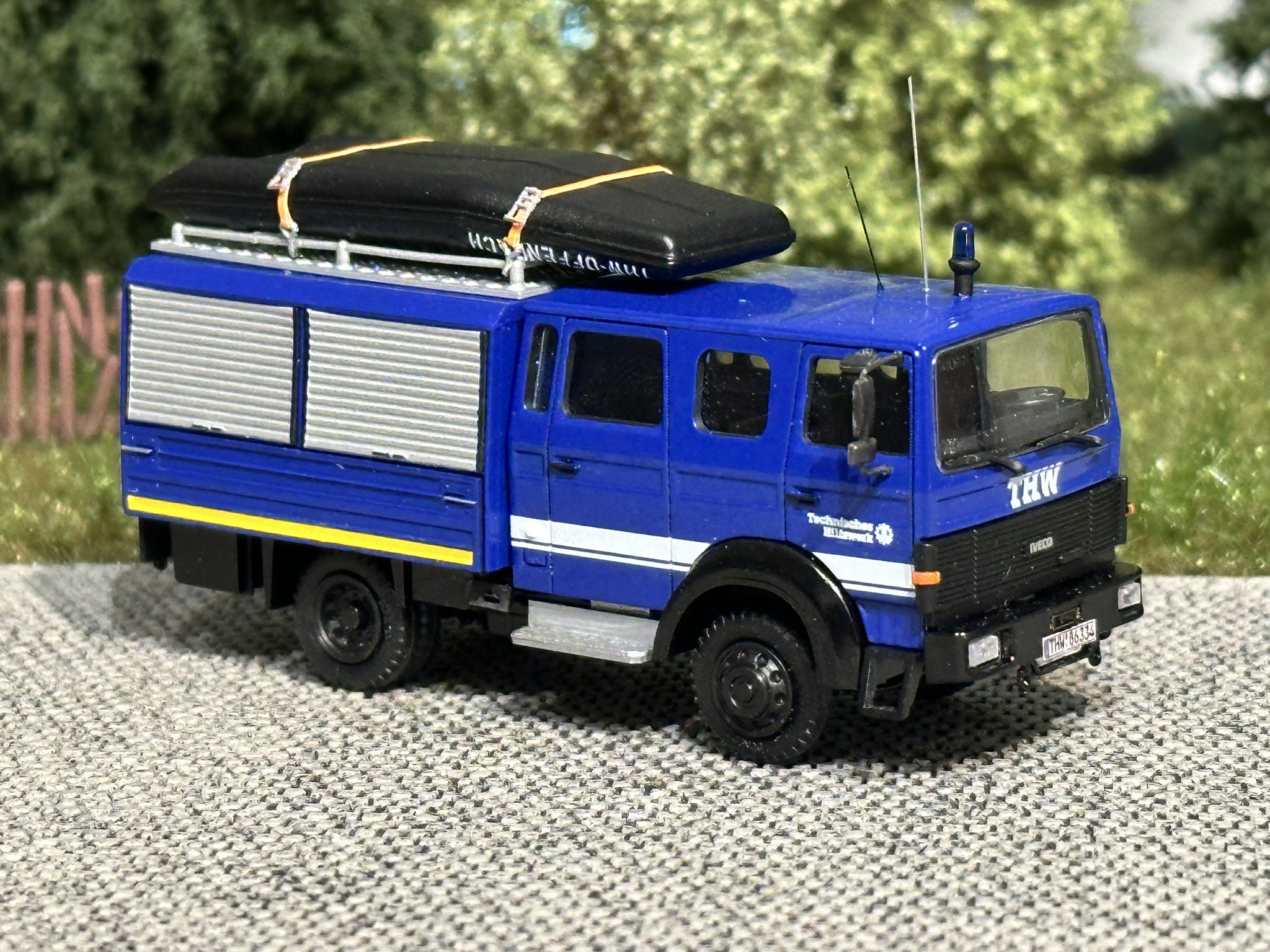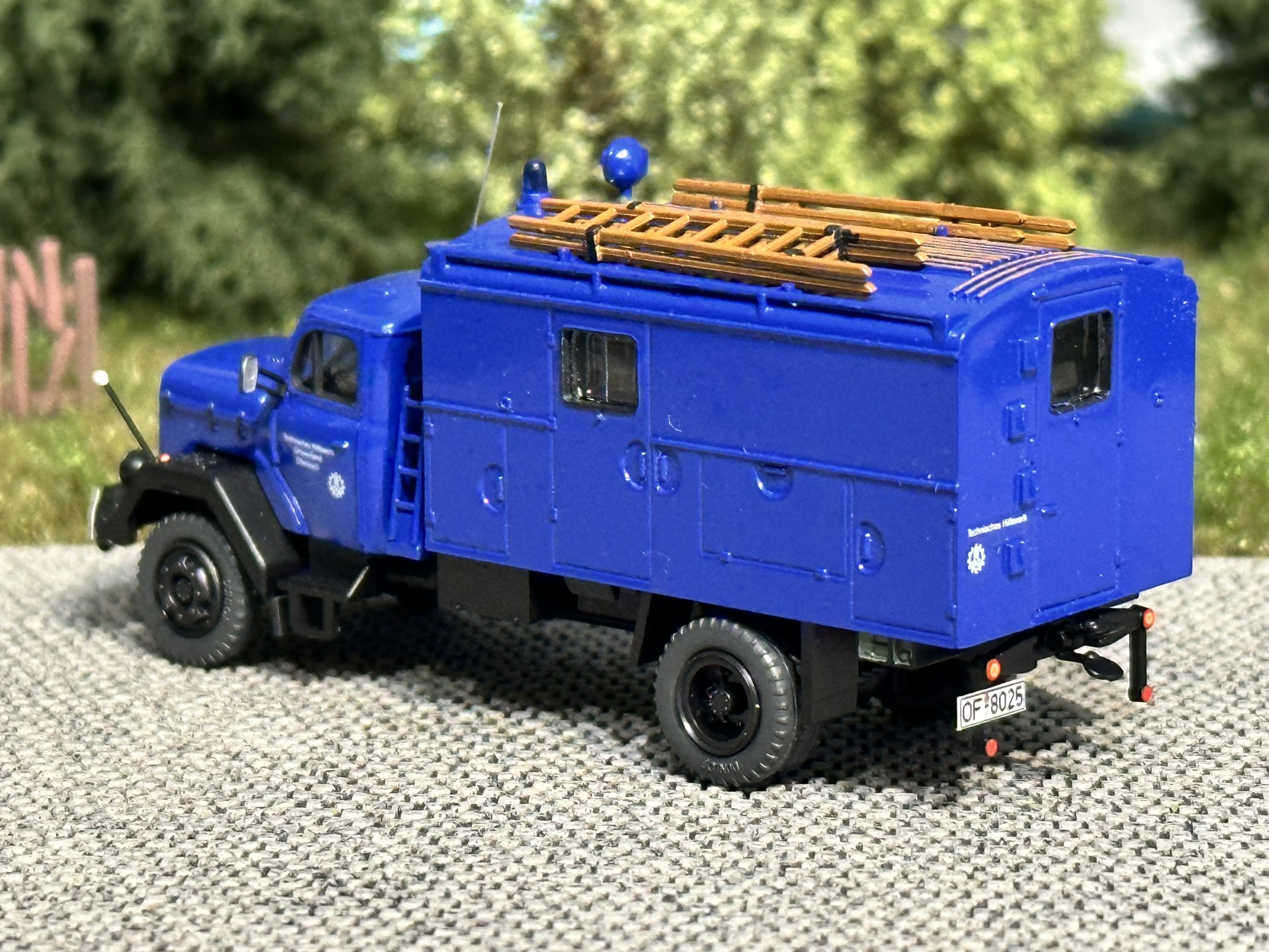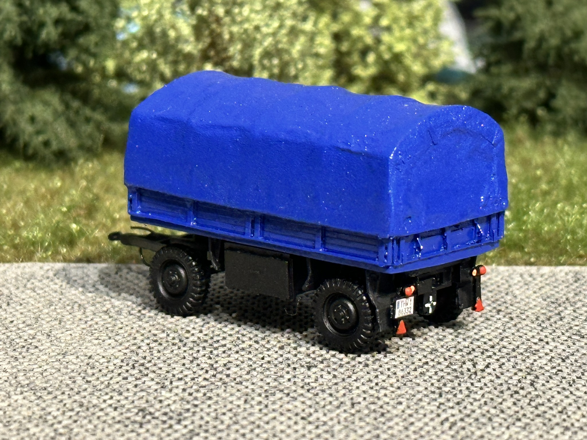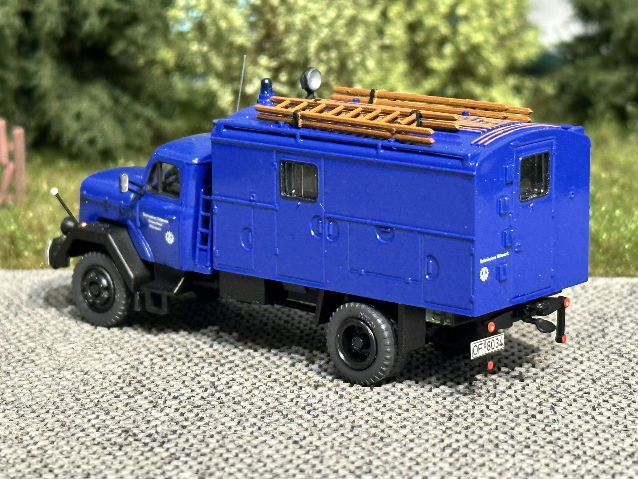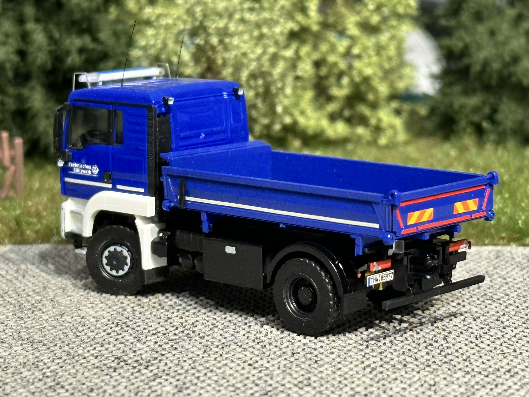Zum Modell: Es handelt sich hier, wie erwartet um die Preiser Modelle. Die Blaulichtsockel auf dem Kabinendach wurden verschliffen, eine neue Stange für die Blaulichter an der Kabinenrückwand angebracht. Am Heck wurde der Unterfahrschutz entfernt, die Scheinwerferhalterung nach oben versetzt, Halter für die Reflektoren und das Kennzeichen angebracht und eine Anhängerkupplung von MMH verbaut.