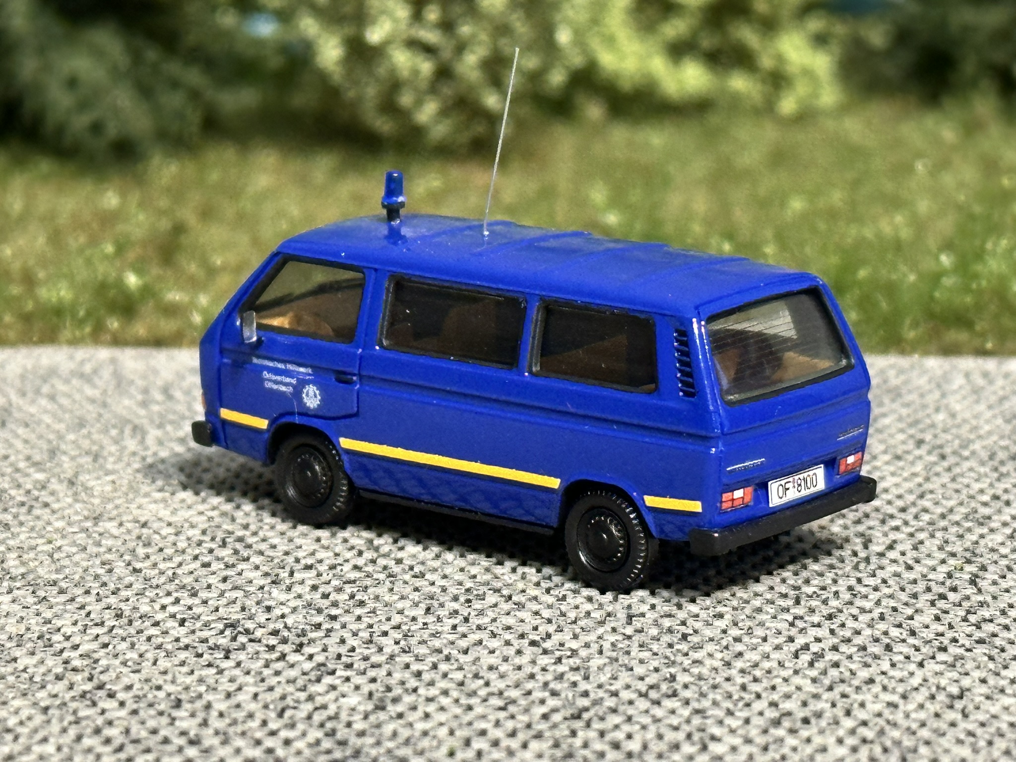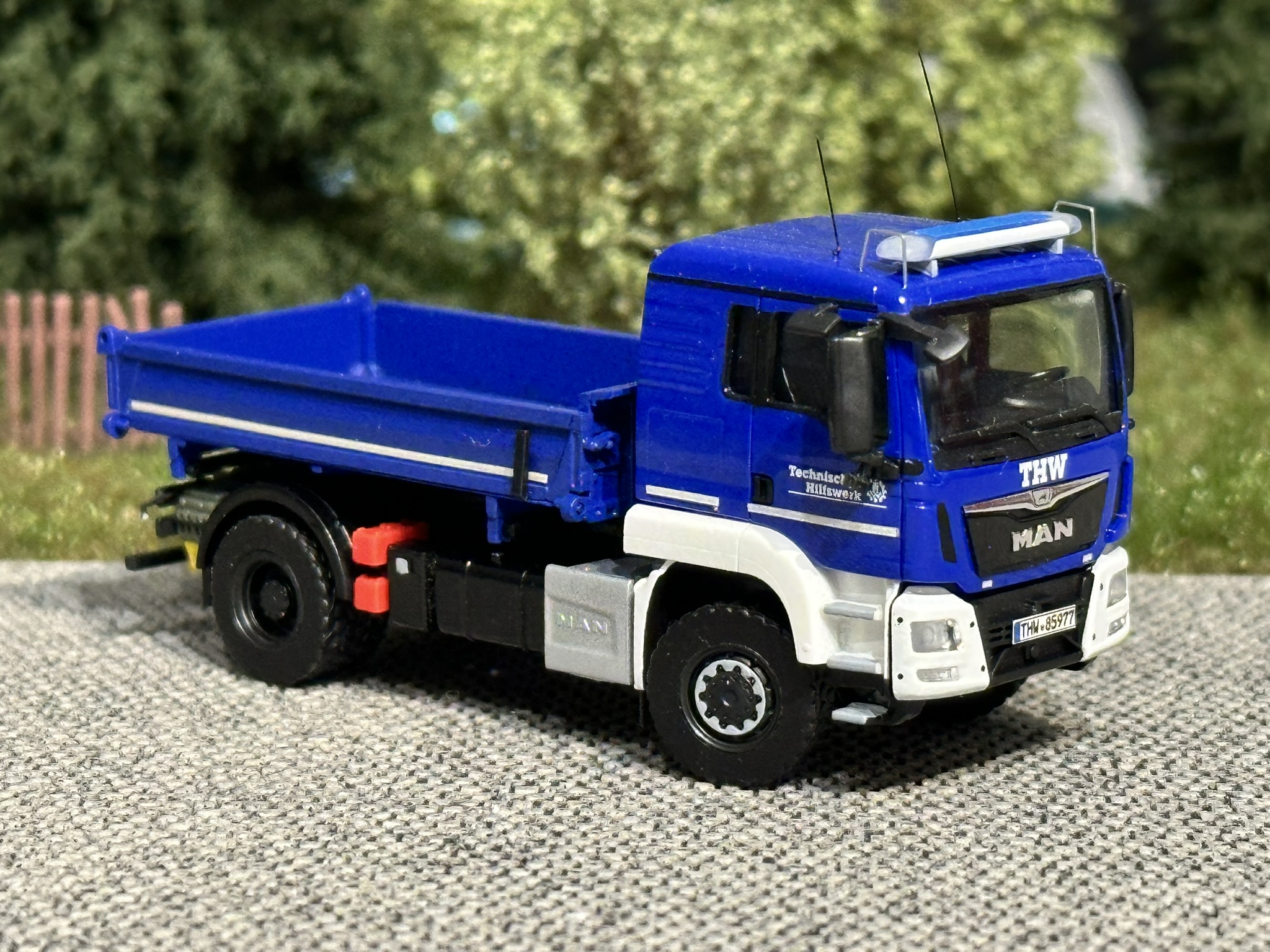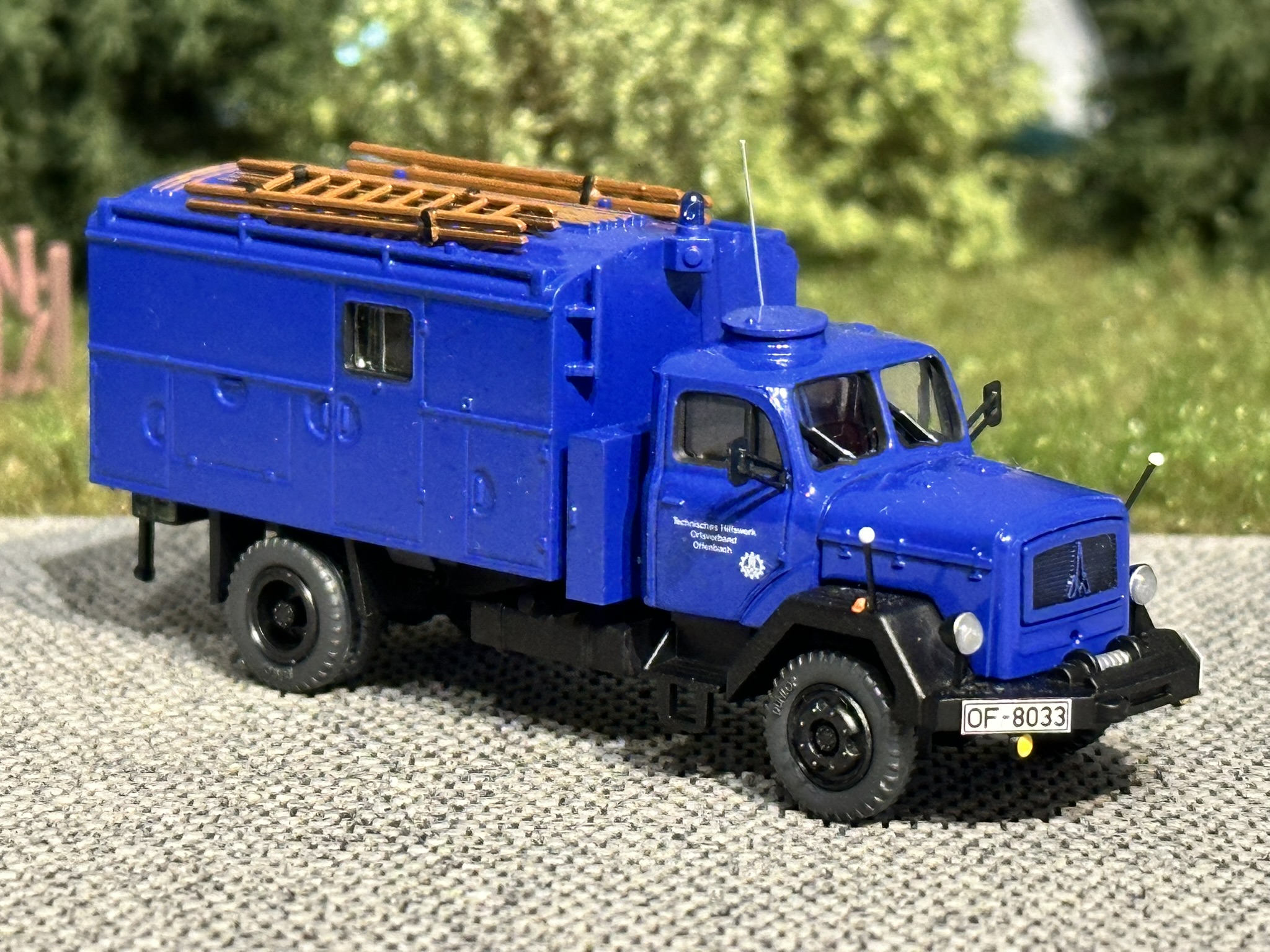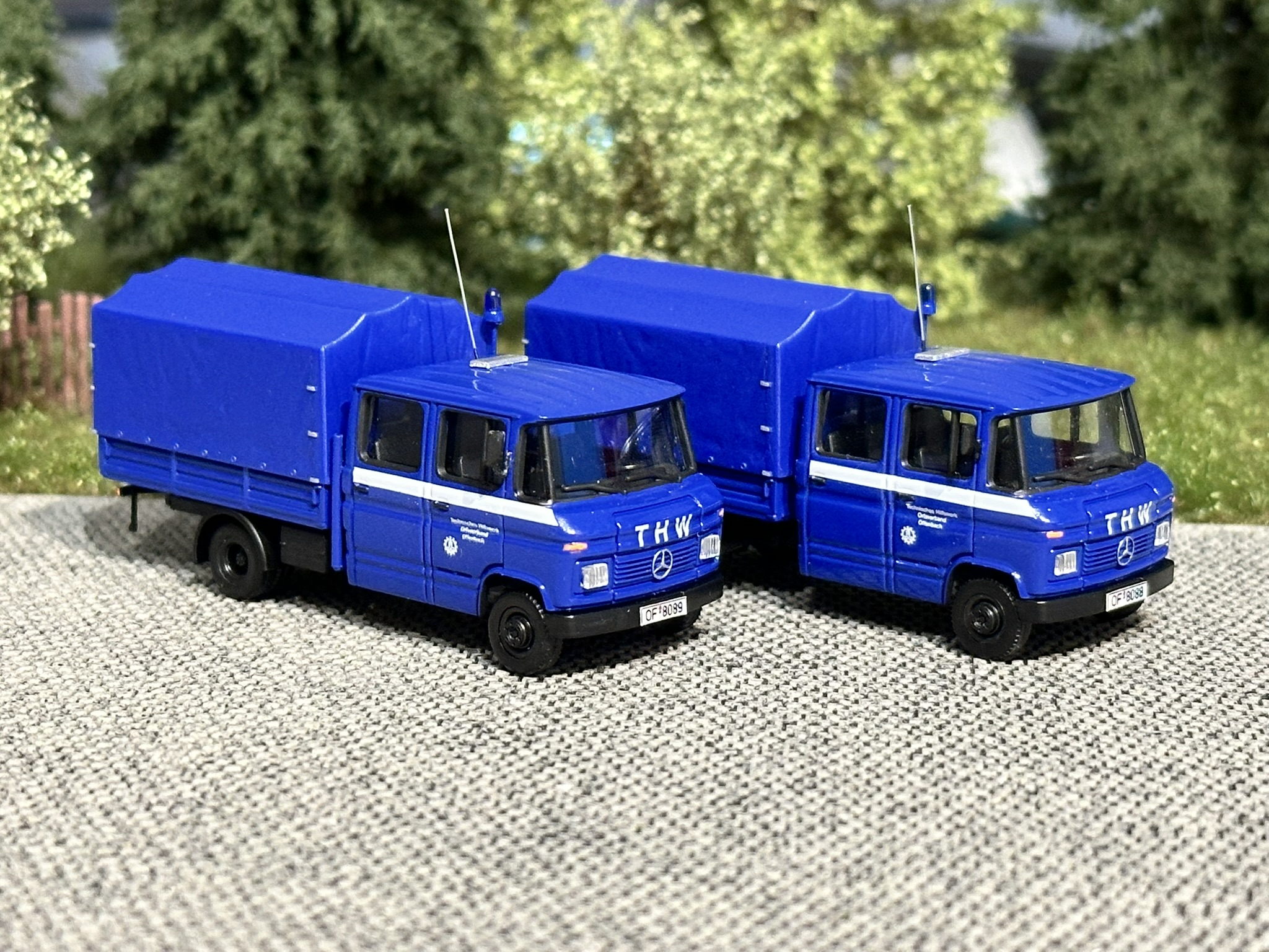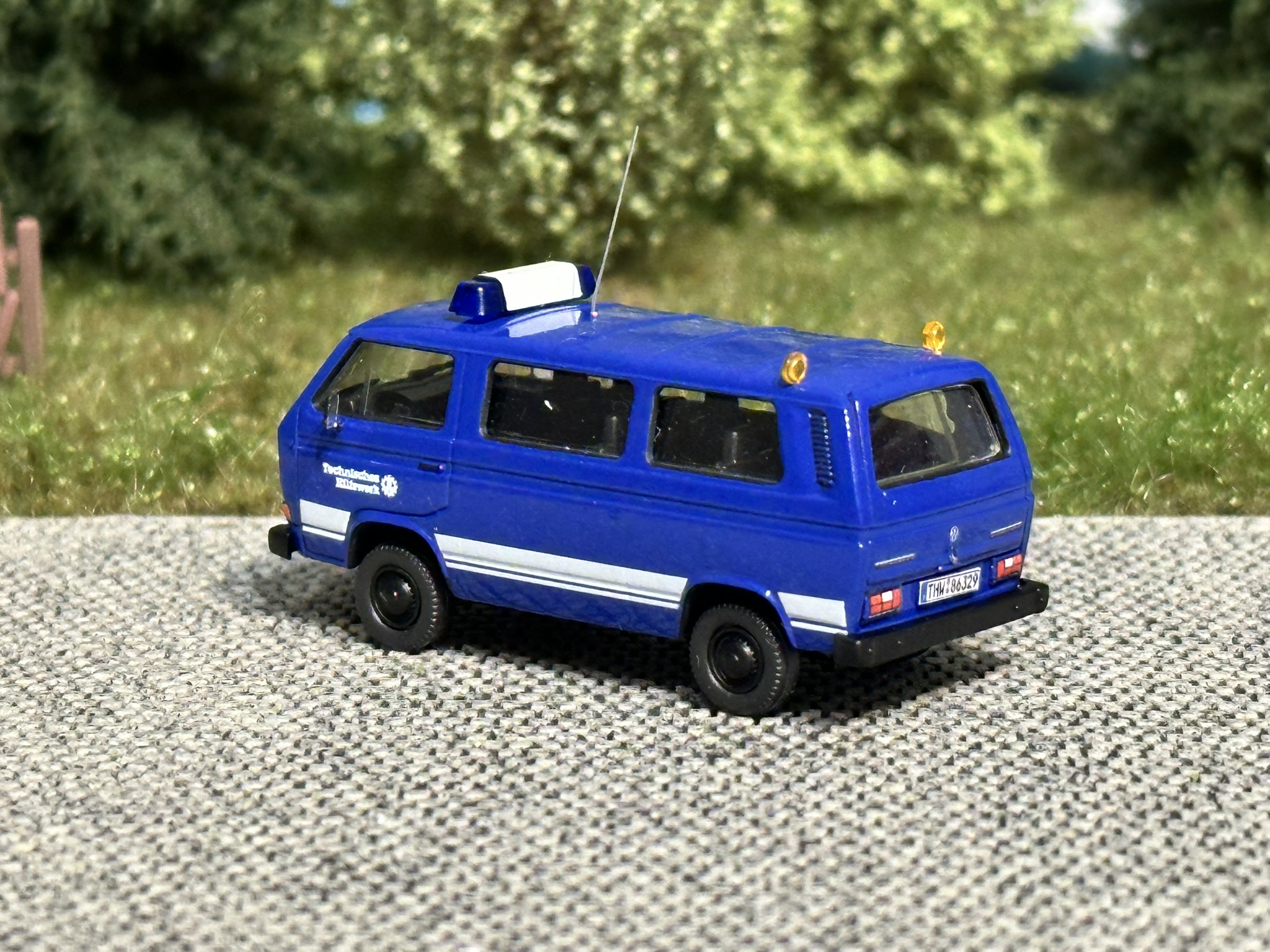 Zum Modell: Es handelt sich hier, wie erwartet um die Preiser Modelle. Die Blaulichtsockel auf dem Kabinendach wurden verschliffen, eine neue Stange für die Blaulichter an der Kabinenrückwand angebracht. Am Heck wurde der Unterfahrschutz entfernt, die Scheinwerferhalterung nach oben versetzt, Halter für die Reflektoren und das Kennzeichen angebracht und eine Anhängerkupplung von MMH verbaut.