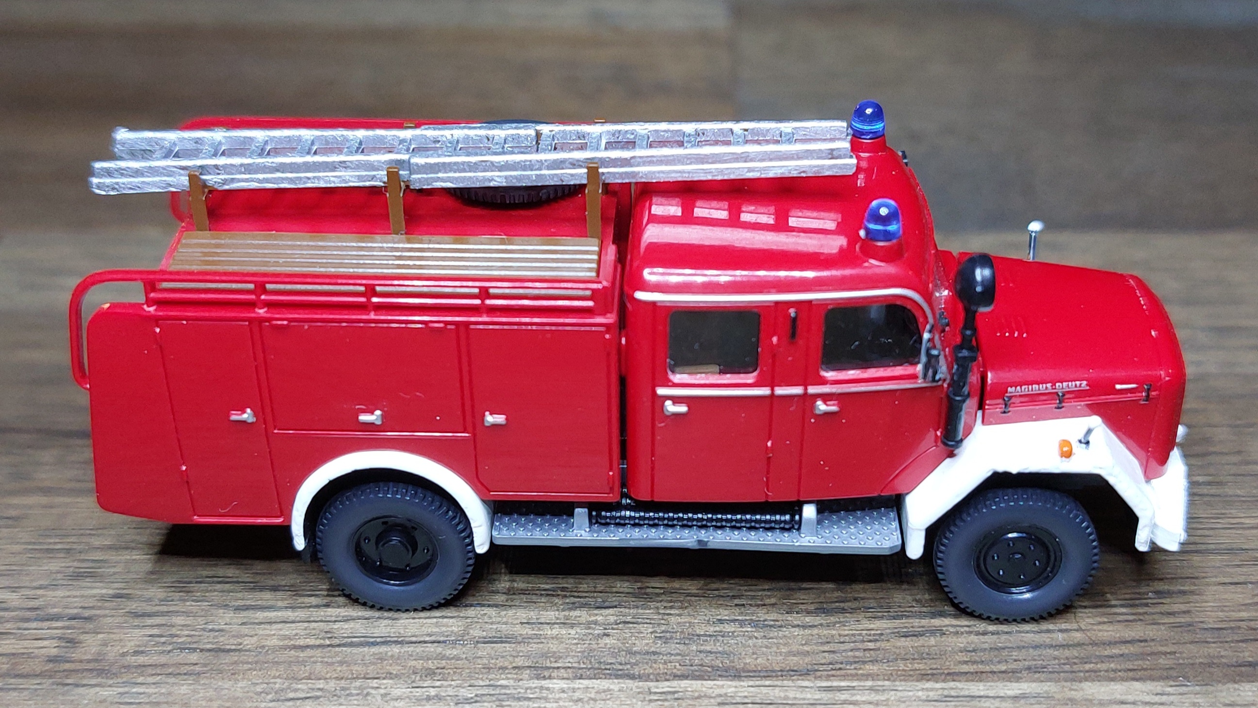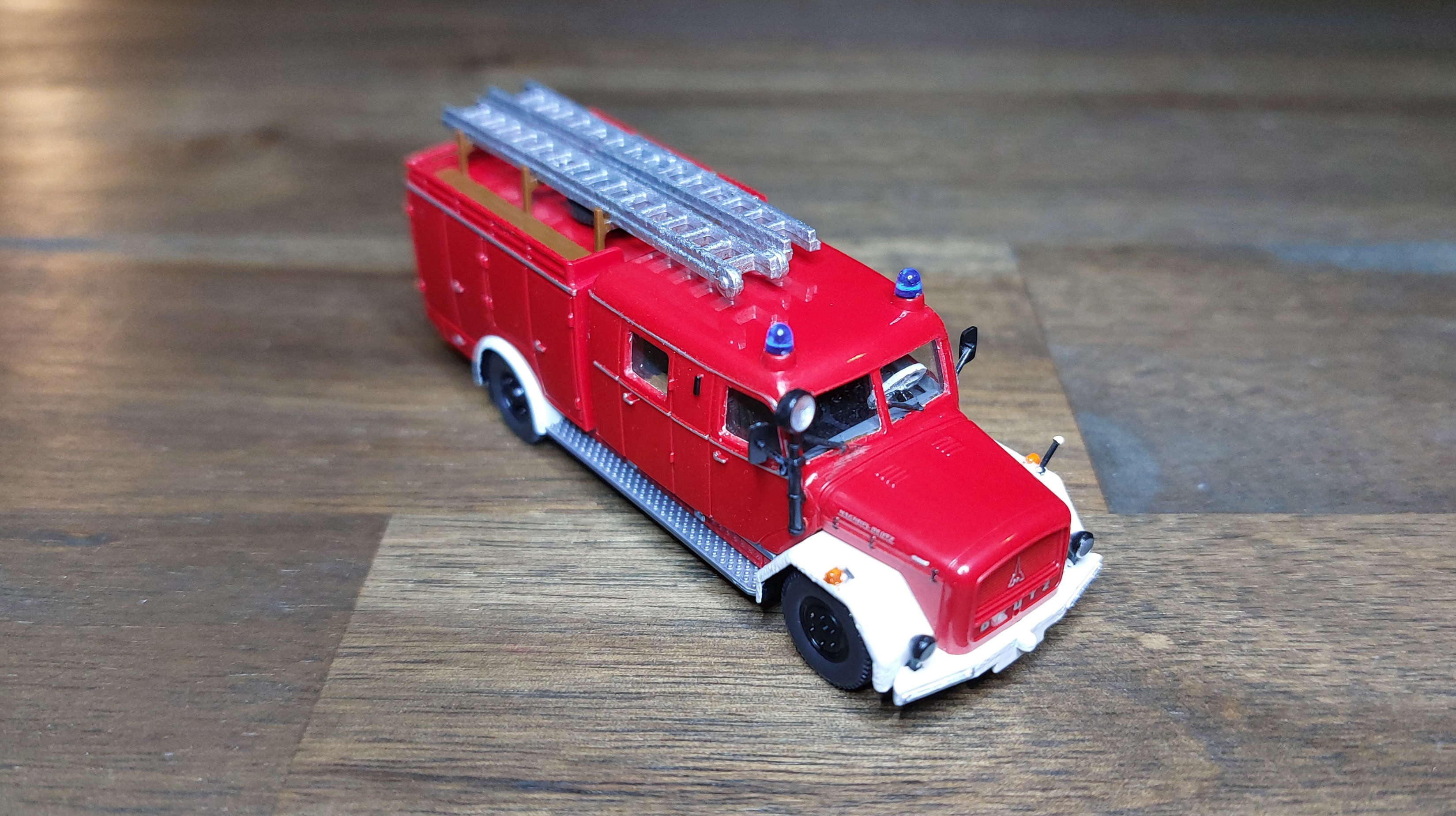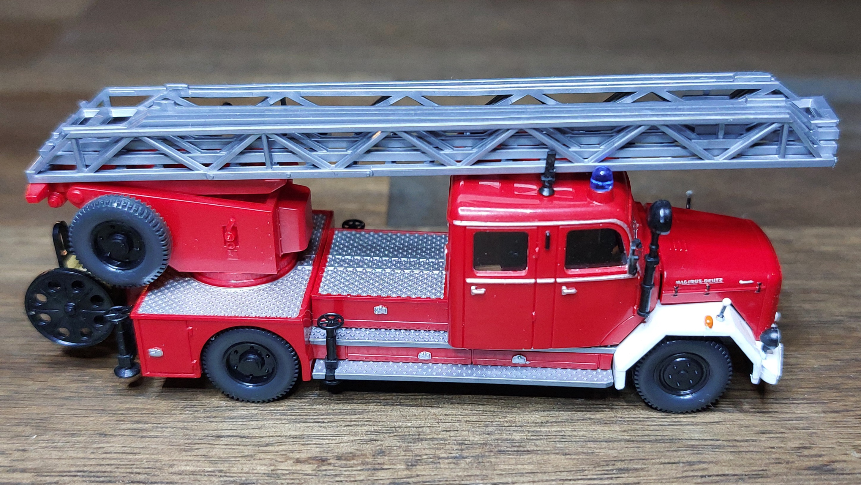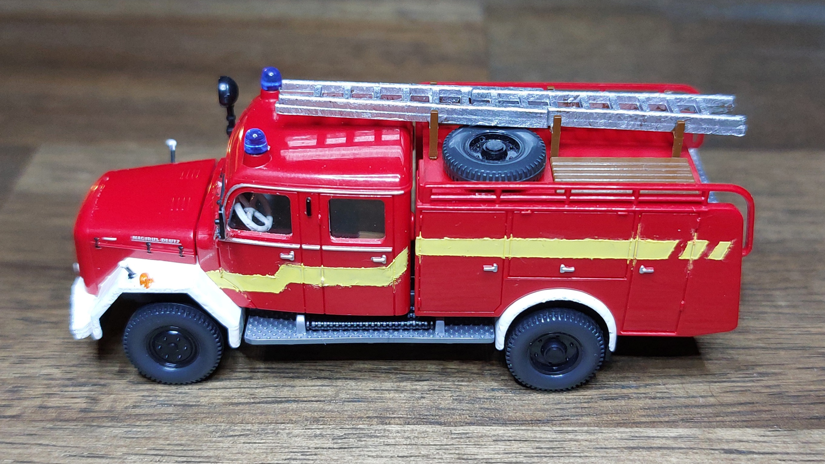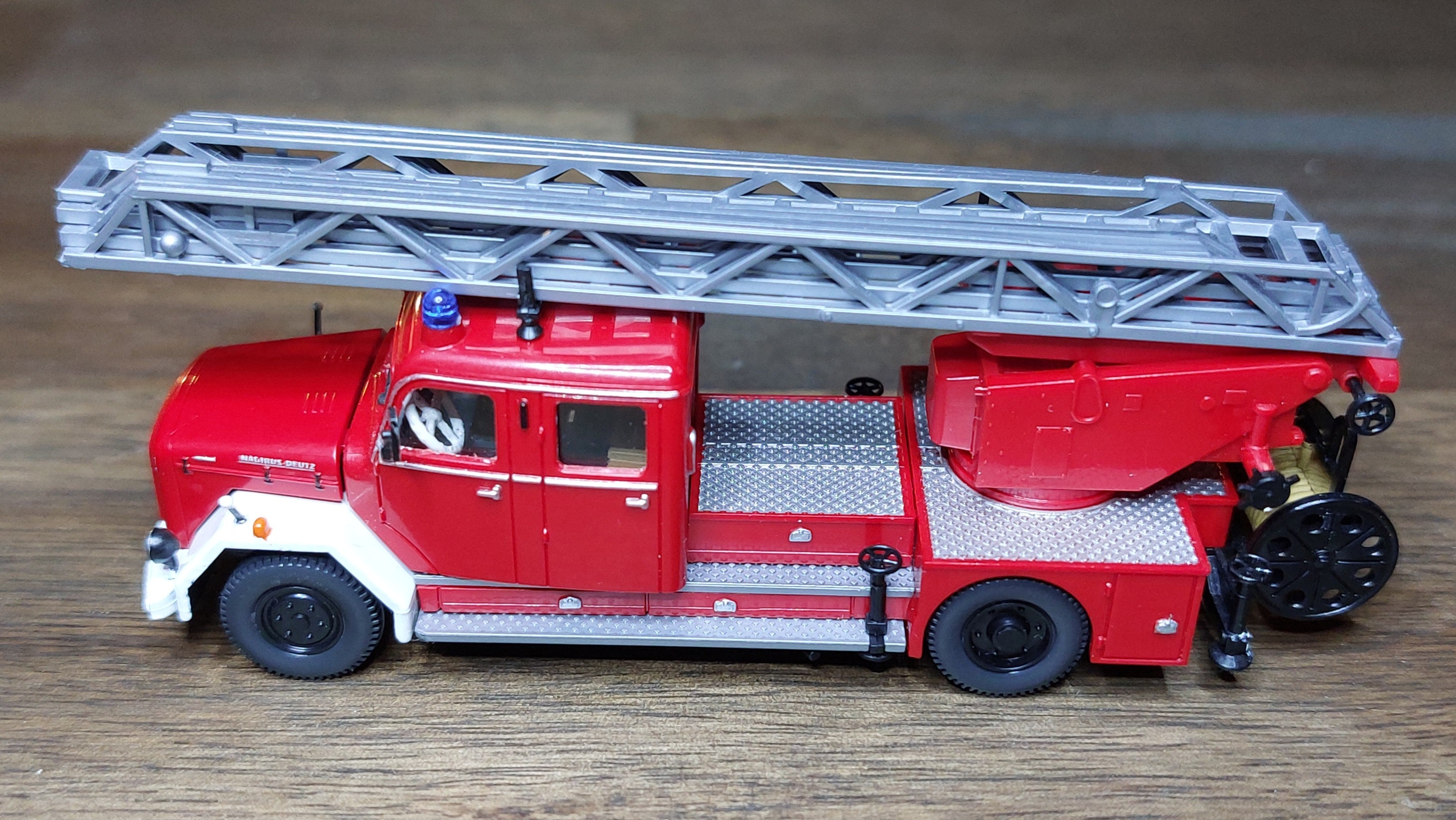 Das LF16 bekam, wie das TLF silberne Leitern, für die Alu-Optik. Ist vielleicht für Fahrzeuge aus den 60ern nicht unbedingt passend, aber so passen sie zu der Drehleiter.