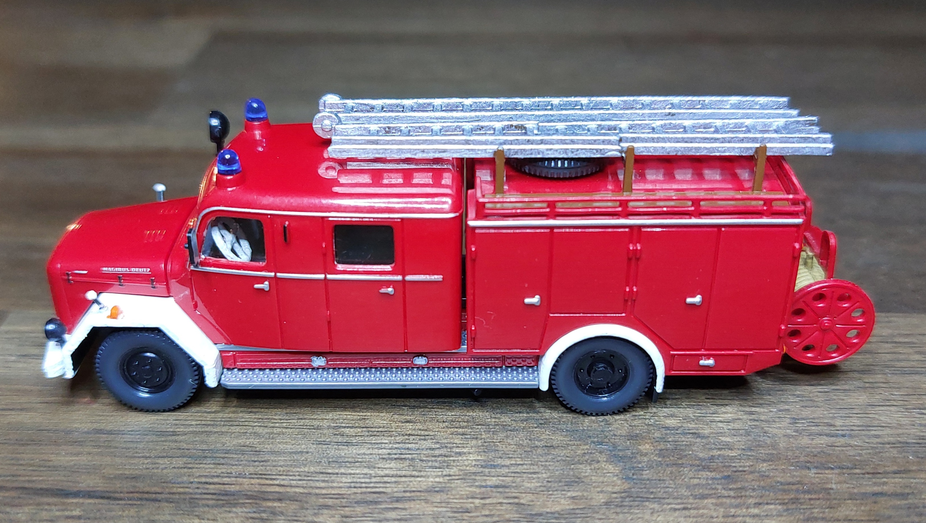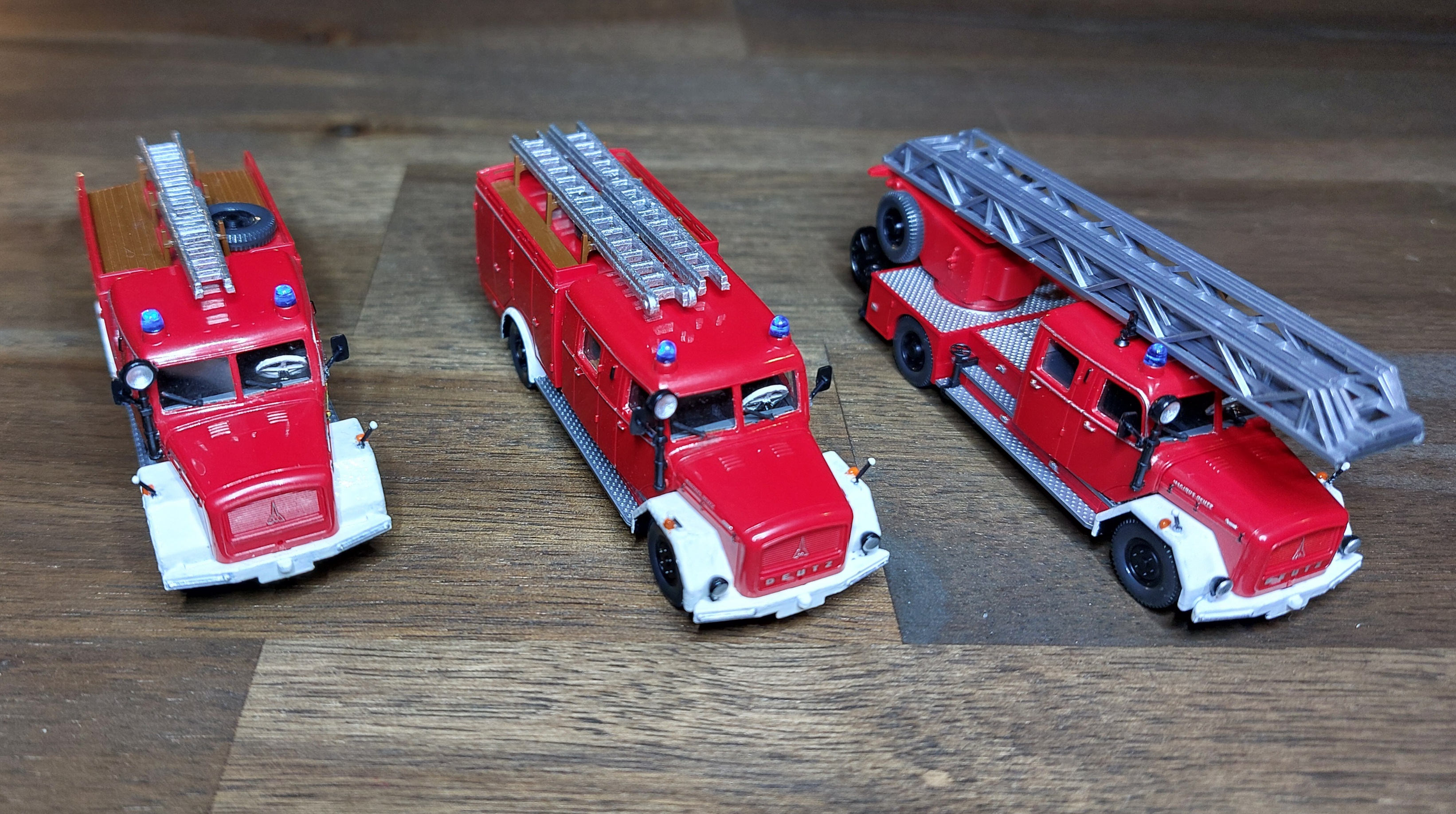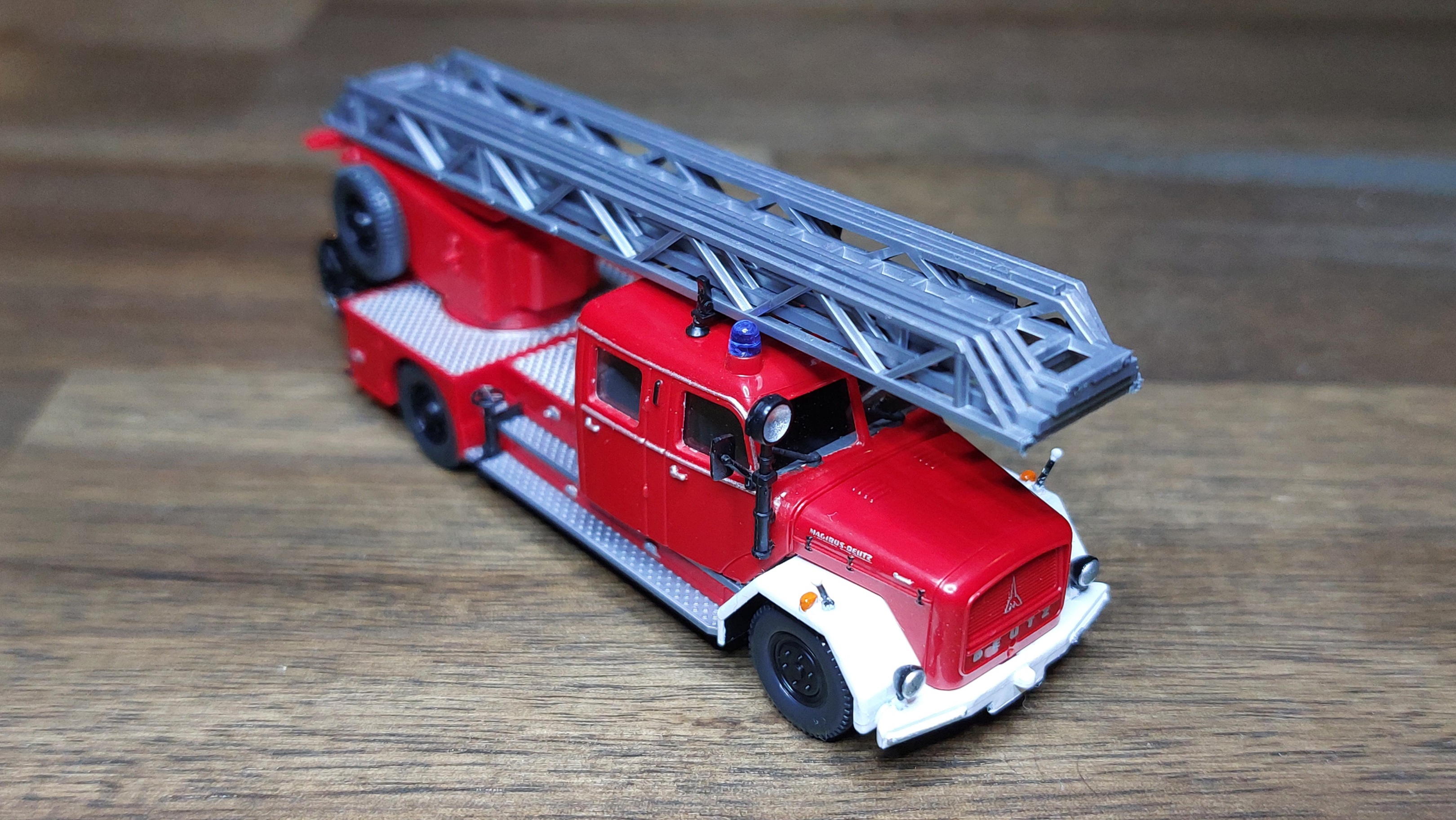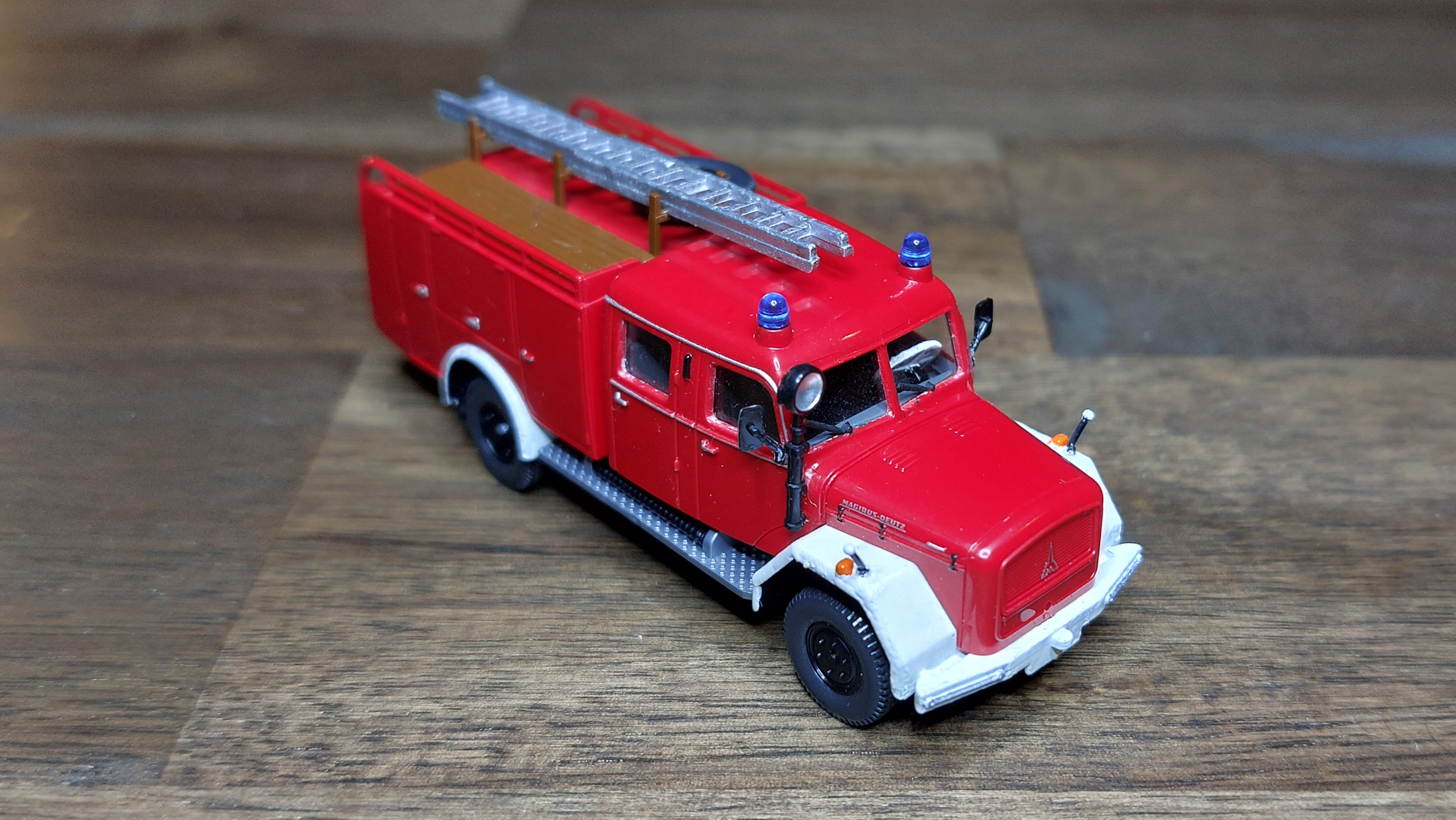 Das LF16 bekam, wie das TLF silberne Leitern, für die Alu-Optik. Ist vielleicht für Fahrzeuge aus den 60ern nicht unbedingt passend, aber so passen sie zu der Drehleiter.