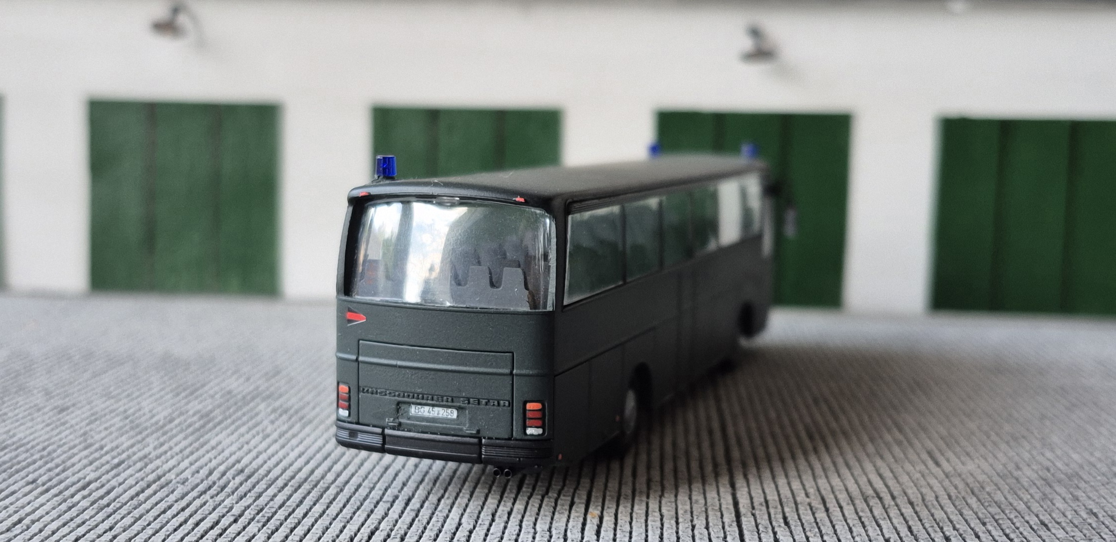 Hier wieder ein paar Bilder. Der Mercedes war mal ein hellgrüner Bereitschaftspolizist, den ich natürlich zweckentfremdet habe. Nach anderthalb Jahren in der Vitrine hat er jetzt auch endlich seine Peilstangen bekommen.