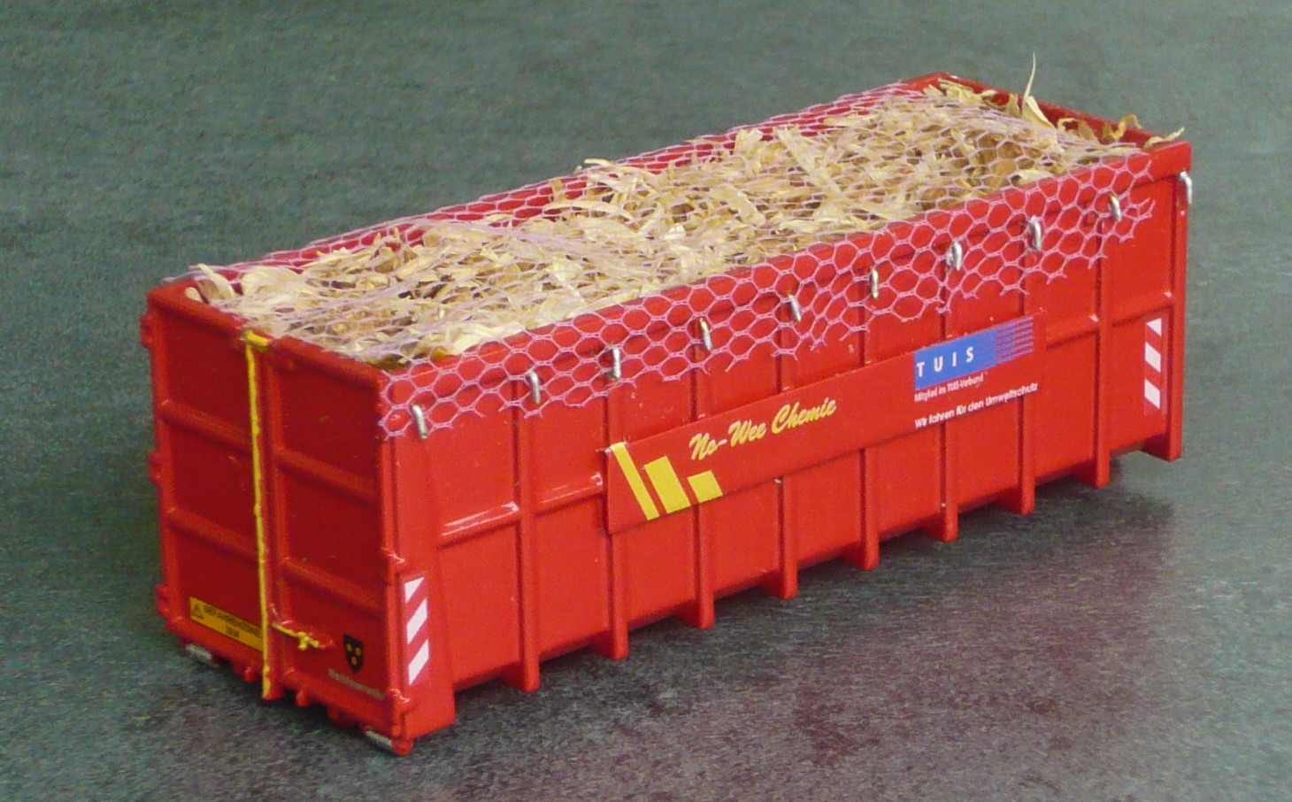 Der Abrollbehälter Mulde stammt von Bemo. Dieser wurde neben der Beladung auch mit einem Abdecknetz versehen: