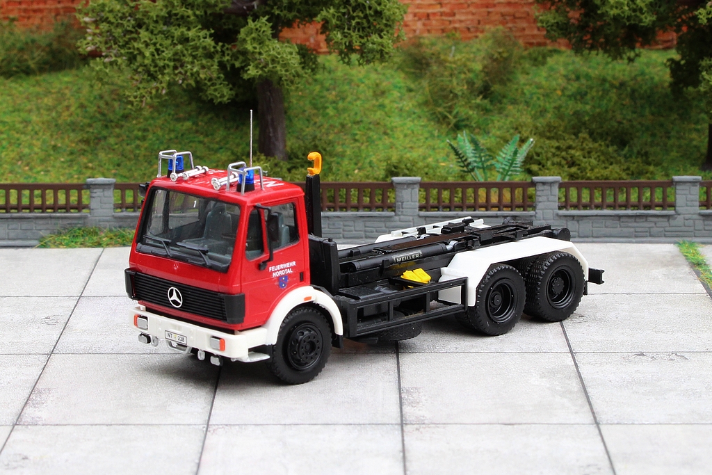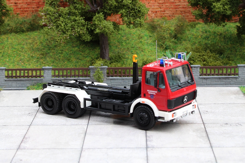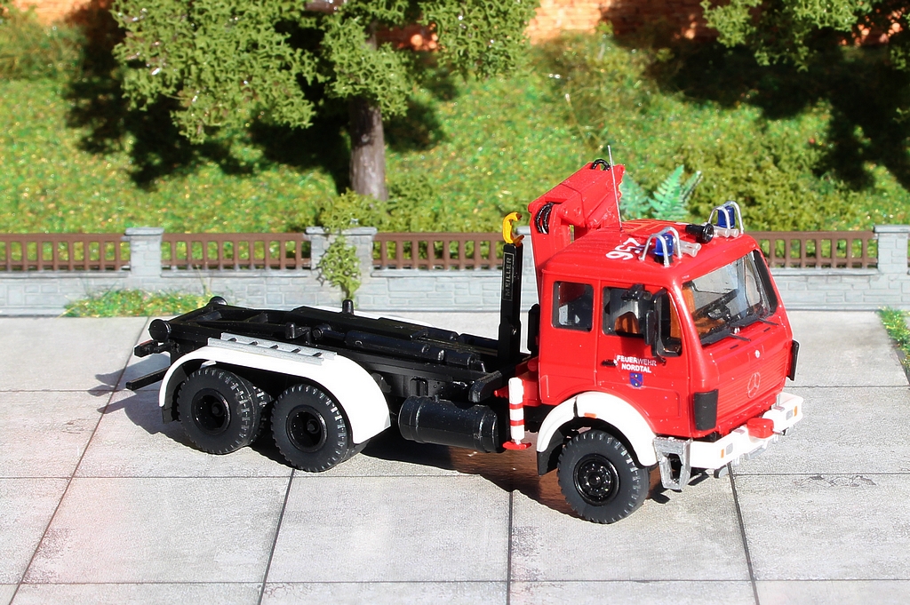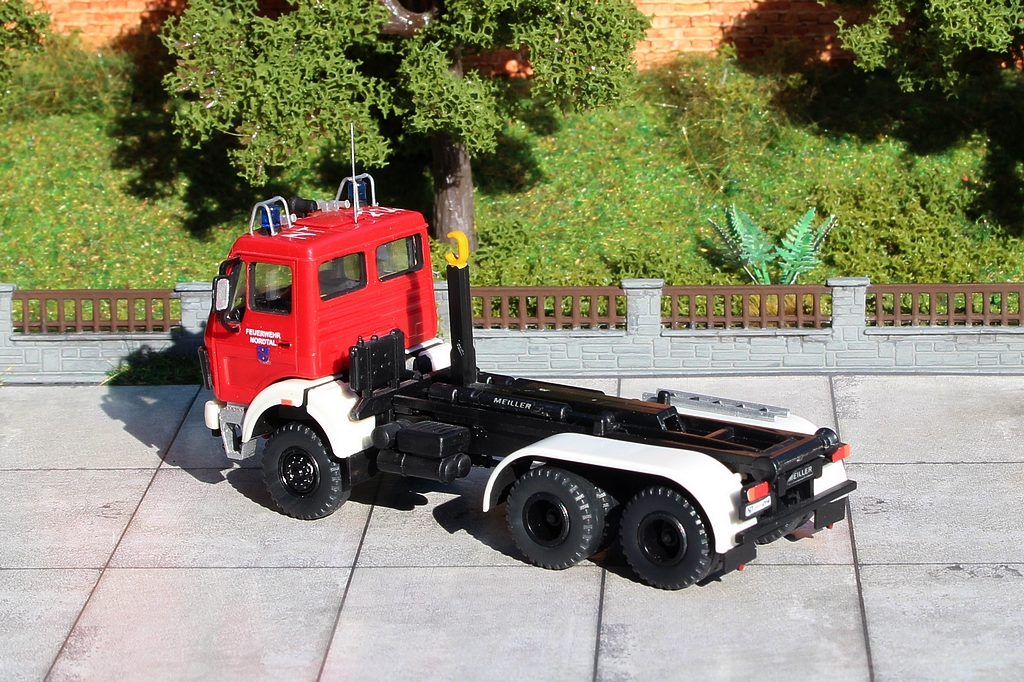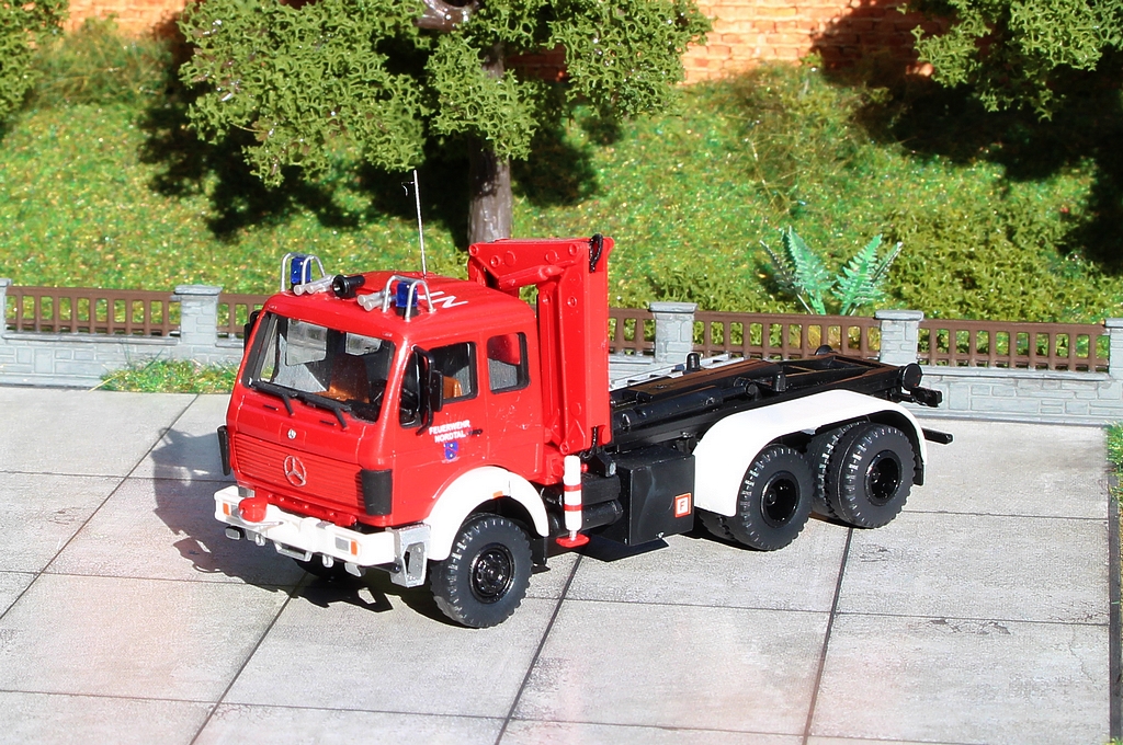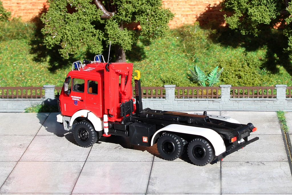 Das Modell entstand auch wieder komplett aus Teilen von Preiser. Das Fahrgestell stammt vom Ludwigshafener TLF, erhielt ein rotes Fernfahrerhaus, eine Abrollvorrichtung und einen Ladekran. Es folgte das Anbringen von Zurüstteilen, Decals und die übliche Detailbemalung.