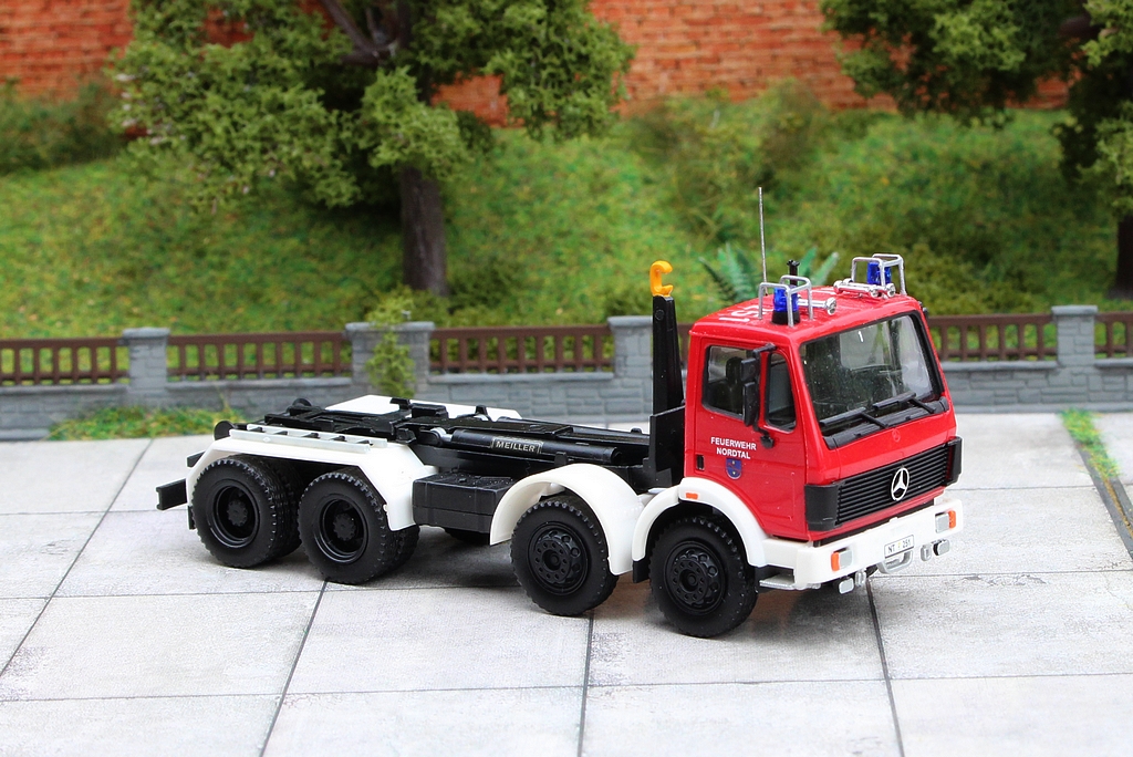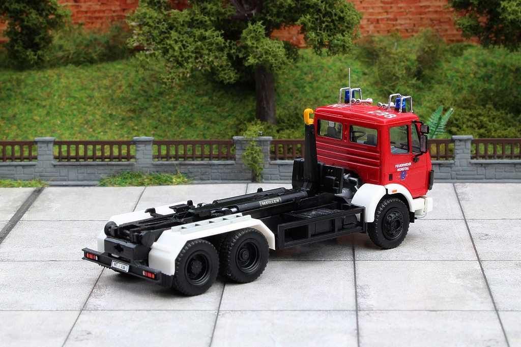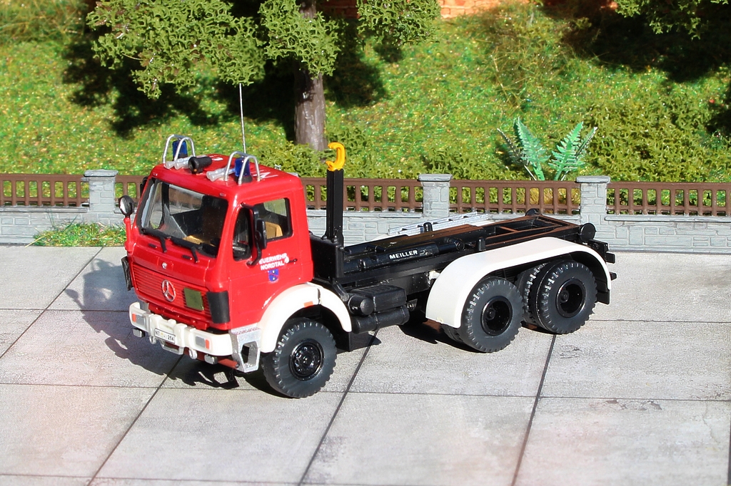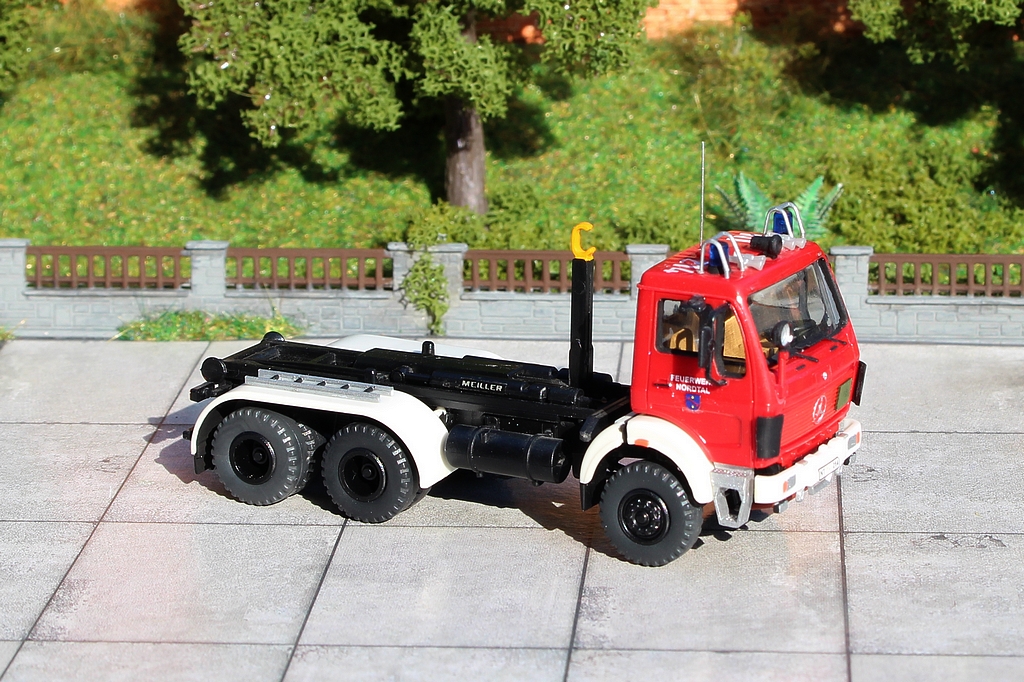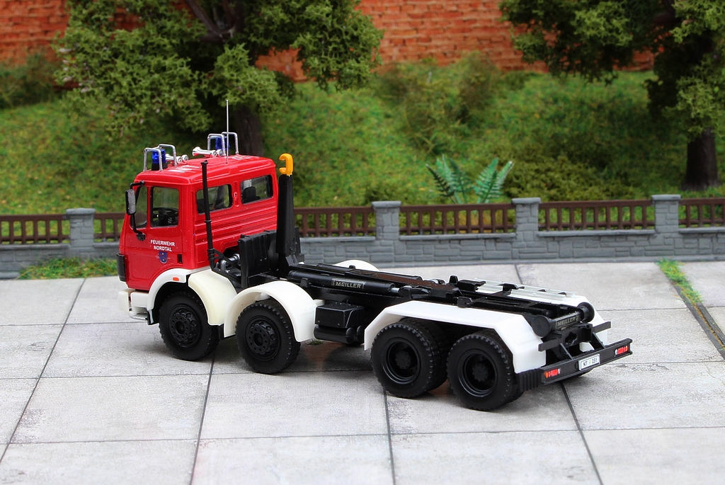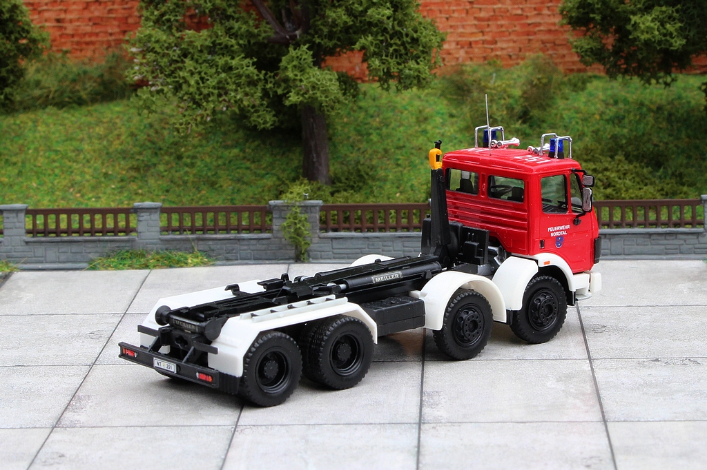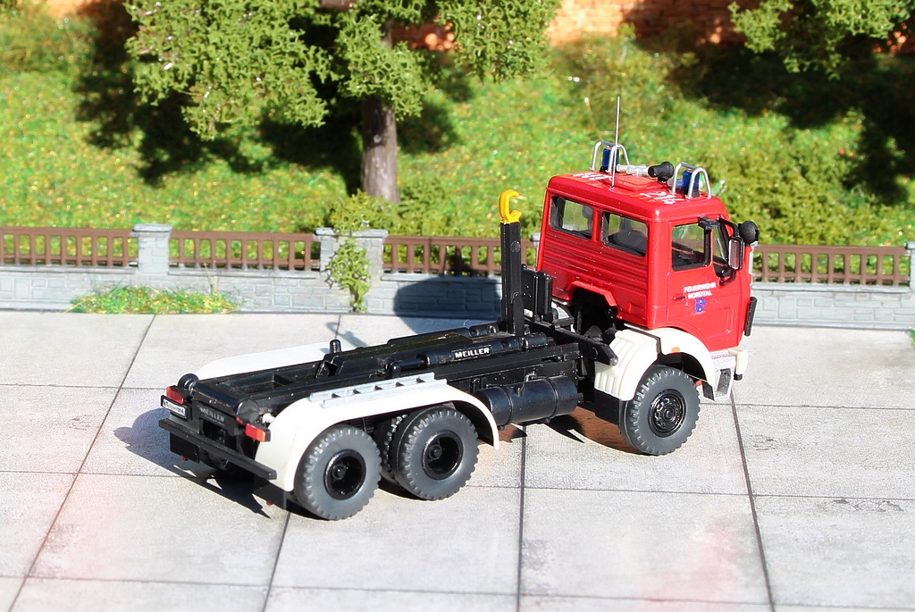 Das Modell entstand komplett aus Teilen von Preiser. Das Fahrgestell stammt von einem 3-Achs Absetzkipper (Kommunalausführung), erhielt ein rotes Fahrerhaus und eine Abrollvorrichtung. Es folgte das Anbringen von Zurüstteilen, Decals und die übliche Detailbemalung.