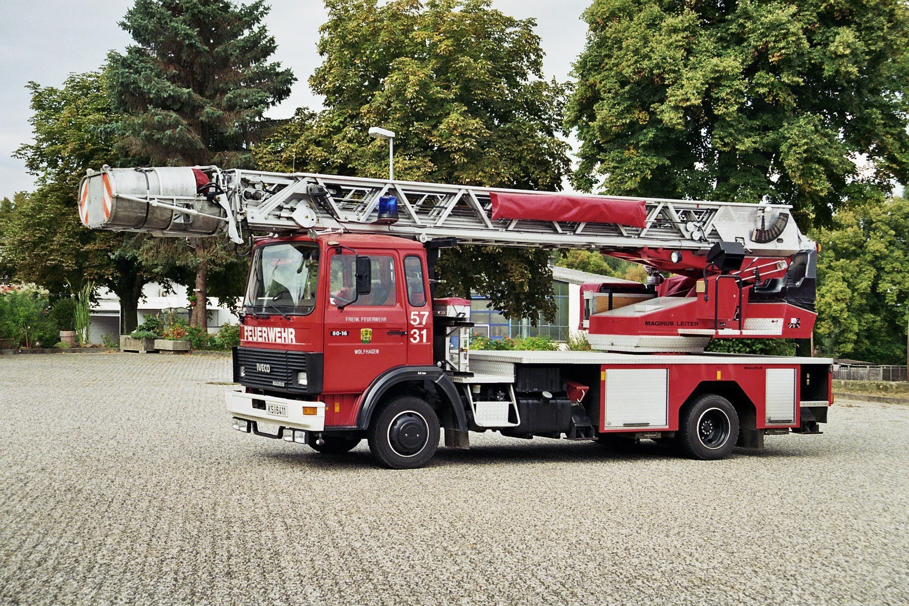 Die FF Wolfhagen im Landkreis Kassel hatte ca. 1987 offentlich einen Lkw-begeisterten Gerätewart und gute Beziehungen zu den heimischen Speditionen, wie die folgenden Bilder beweisen! Man achte u.a. auf solche Feinheiten wie "Weißwandreifen" (auch an der Haspel), Wimpelketten in der Frontscheibe, vier Zusatzscheinwerfer pro Fahrzeug, Schmutzfänger mit Verkehrszeichen, Sonnenblende usw.: