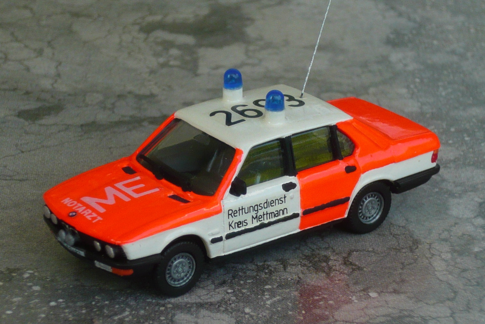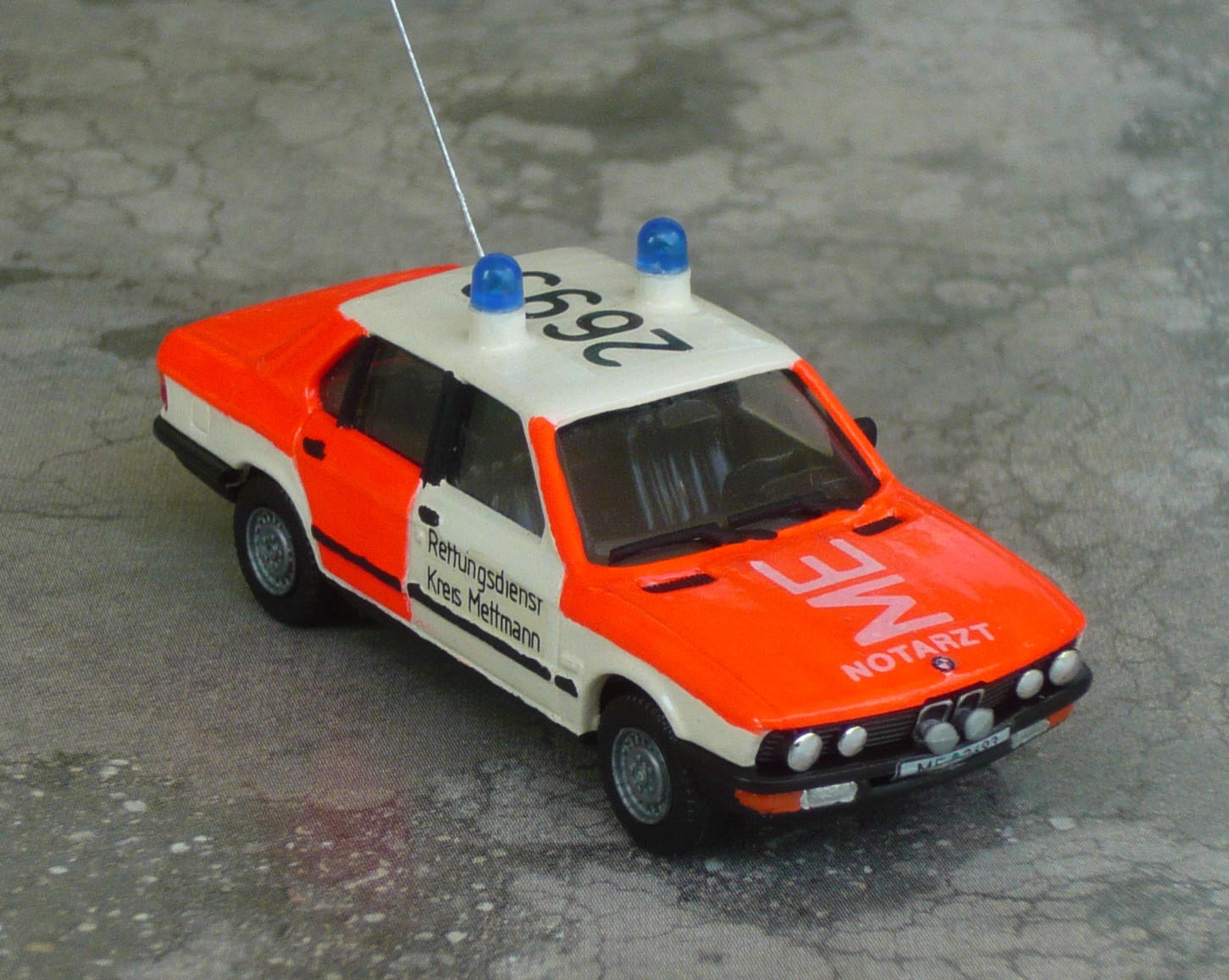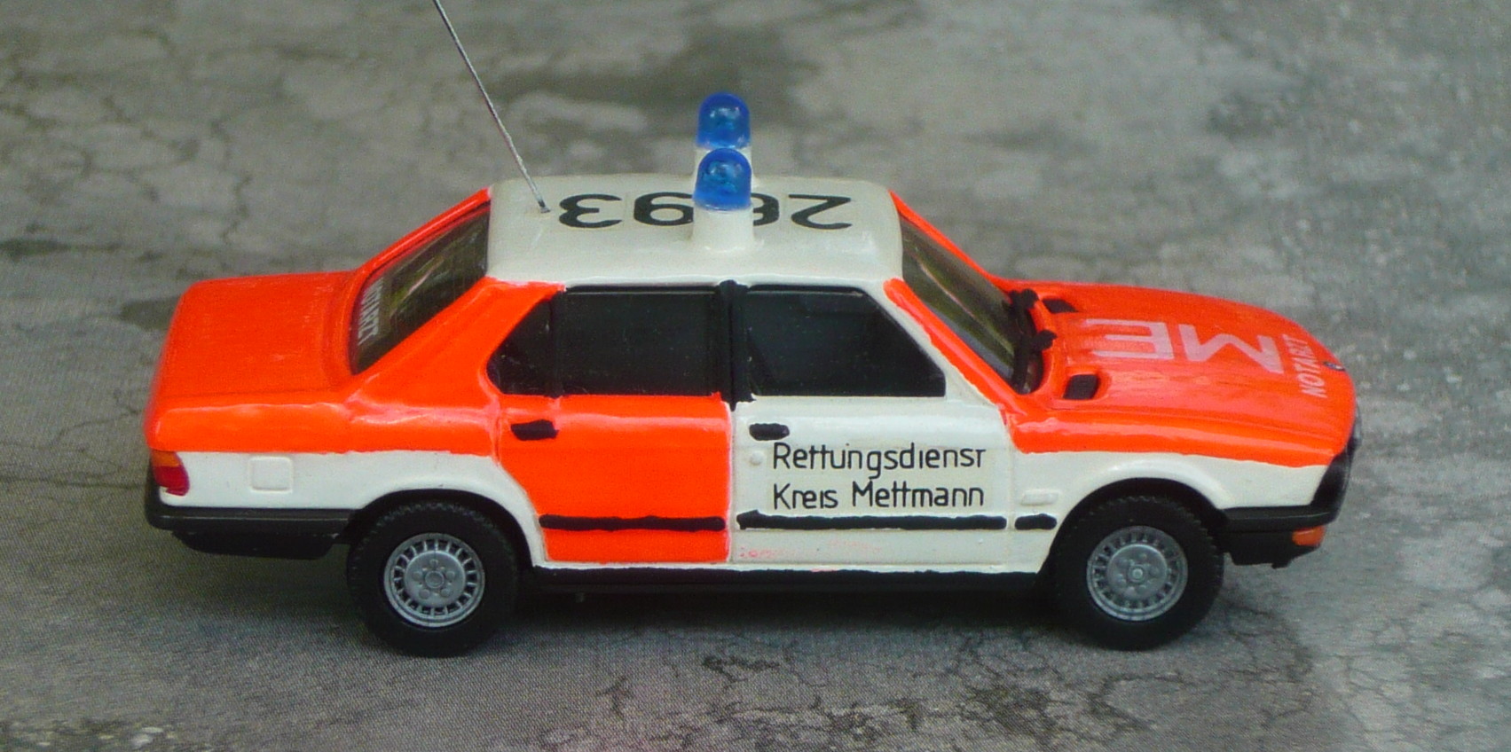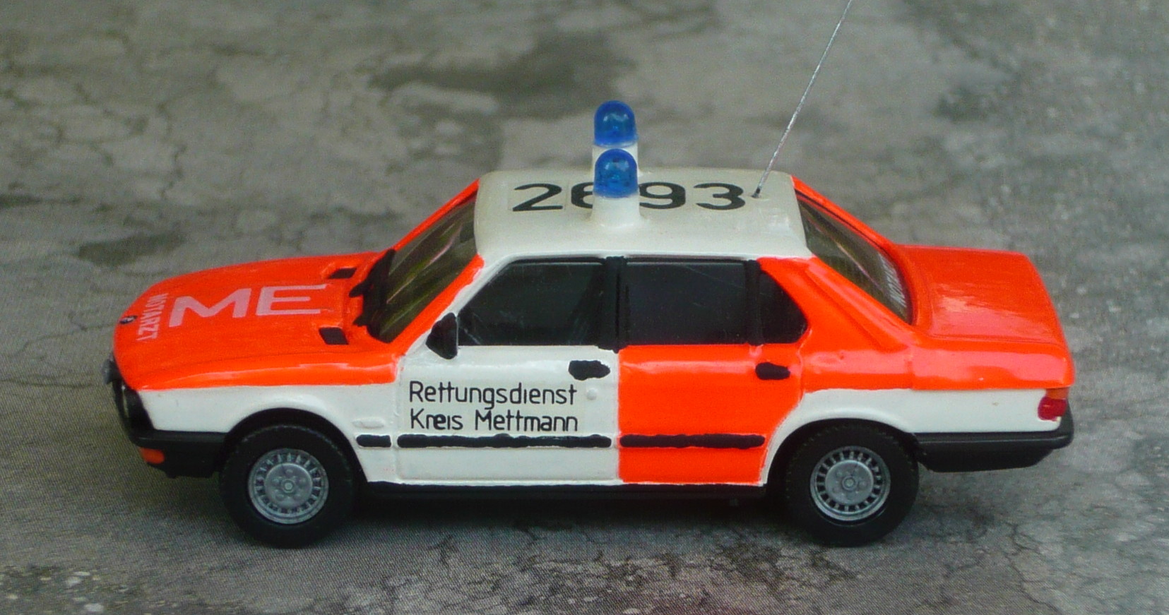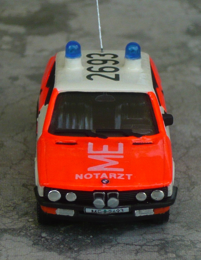 Der 5er BMW von Herpa diente mir vor gut 20 Jahren als Basis für das Mettmanner NEF. Eine "Jugendsünde" sozusagen... Ich ärgere mich bis heute darüber, daß mein Modell keinen zweiten Außenspiegel hat