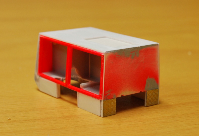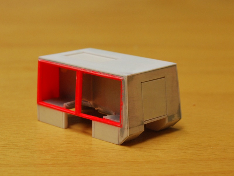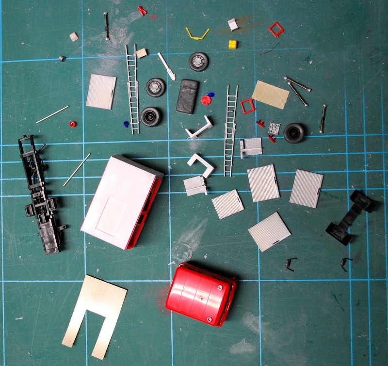 Wie schon richtig vermutet, handelt es sich um den Ziegler-LF-Aufbau von Preiser (31128). Zu erst habe ich die Front- und Heckseite am Dach eben gefeilt, da der Ziegler-Aufbau ein rundes Dach hat. Anschließend wurden zwei 3-eckige Teile aus 0,75mm Bastelplatte geschnitten und bündig an die äußeren Kanten am Heck geklebt. Der nun entstandene Zwischenraum wurde ebenfalls bündig mit einer Platte verschlossen. In die Platte habe ich die Klappe zum Pumpenraum integriert. Das Dach wurde ebenfalls mit einer dünnen Platte versehen. Das Dach bekommt später ein Riffelblech von FKS. Die tiefgezogenen Geräteräume (6mm) wurden anschließend angeklebt und das Heck entsprechend angepasst. Als Kotflügel werde ich später die geänderten Preiserteile des Ziegler-LF verwenden.