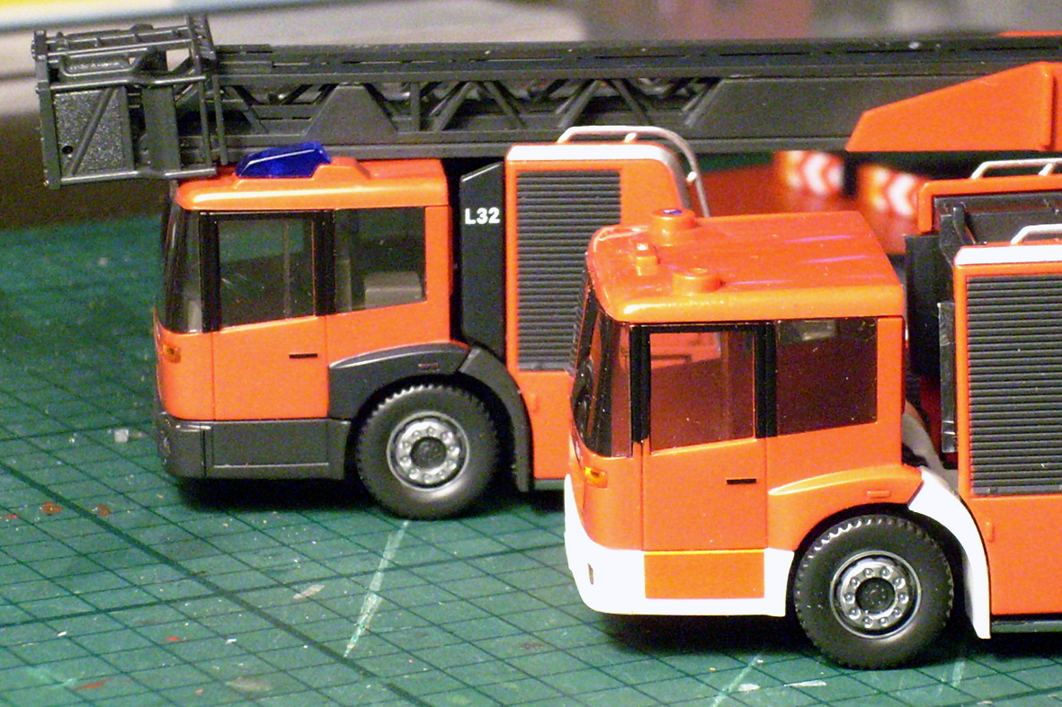 Und wenn ich dafür schon alles radikal abschneiden muß, dann kann ich ja auch gleich die Seitenverblendung verlängern; schließlich soll ja wie bei der Atego-DL wieder "Feuerwehr Nordstadt" draufstehen! Davon mal abgesehen, ist die Wiking-Blende ebenfalls viiiiel zu dick - also weg damit! Logisch, daß die Form dabei unverändert bleibt...