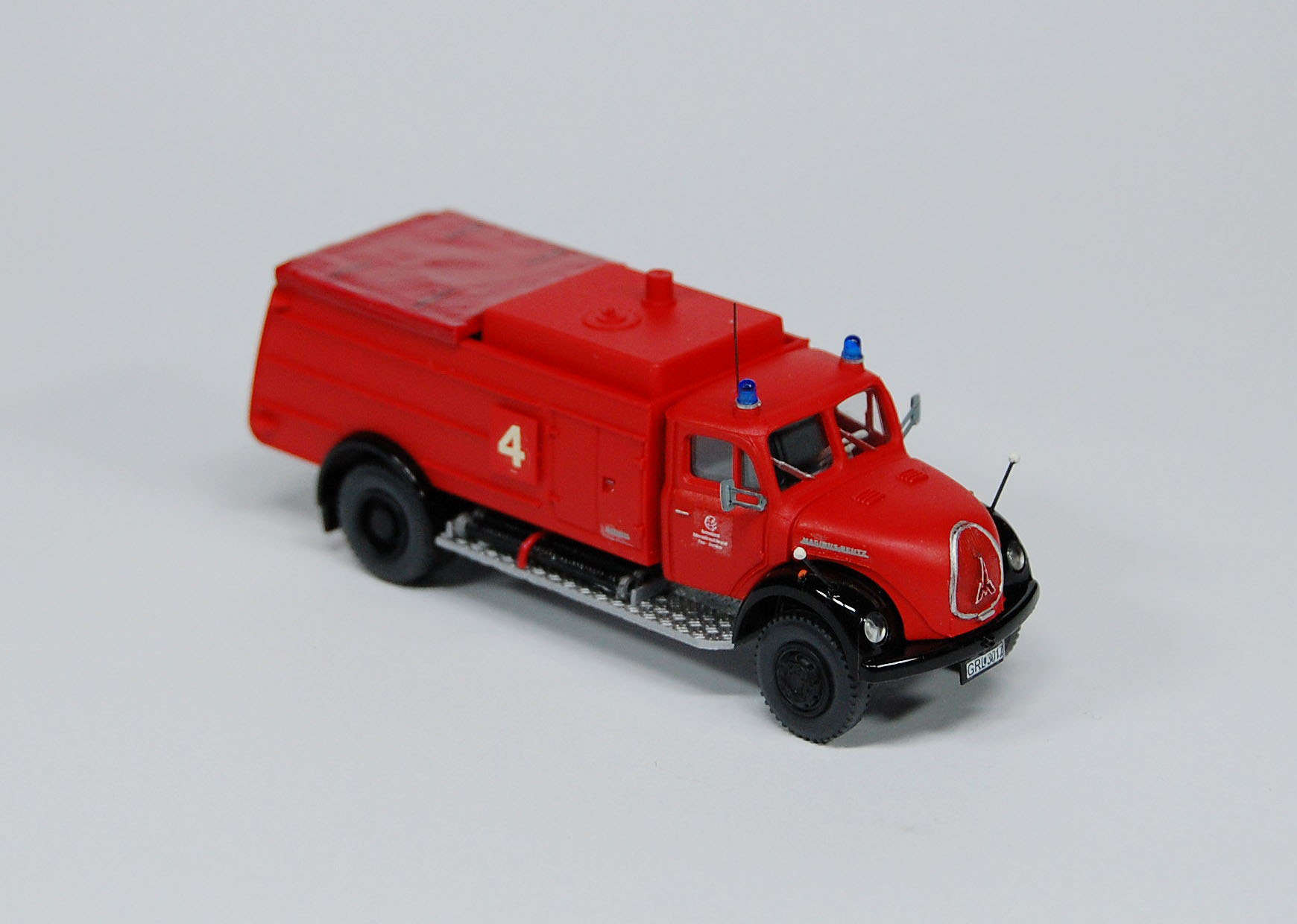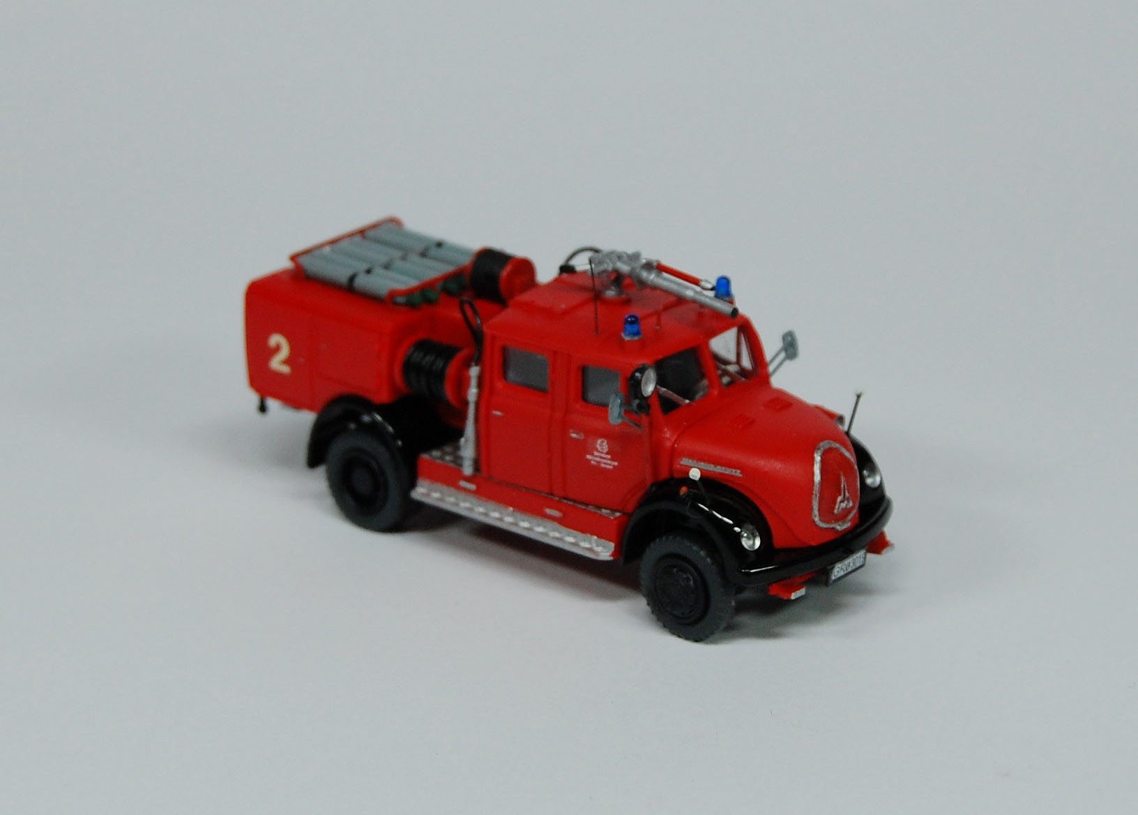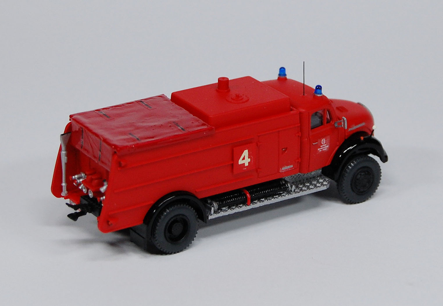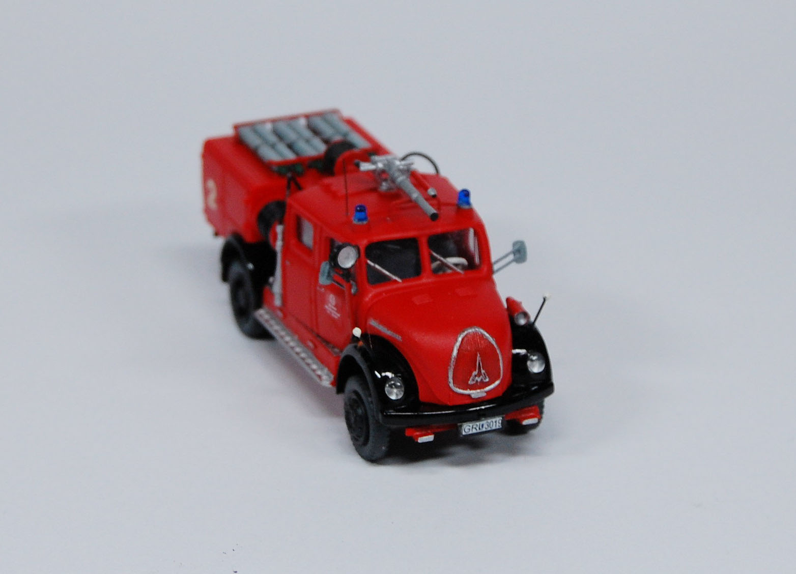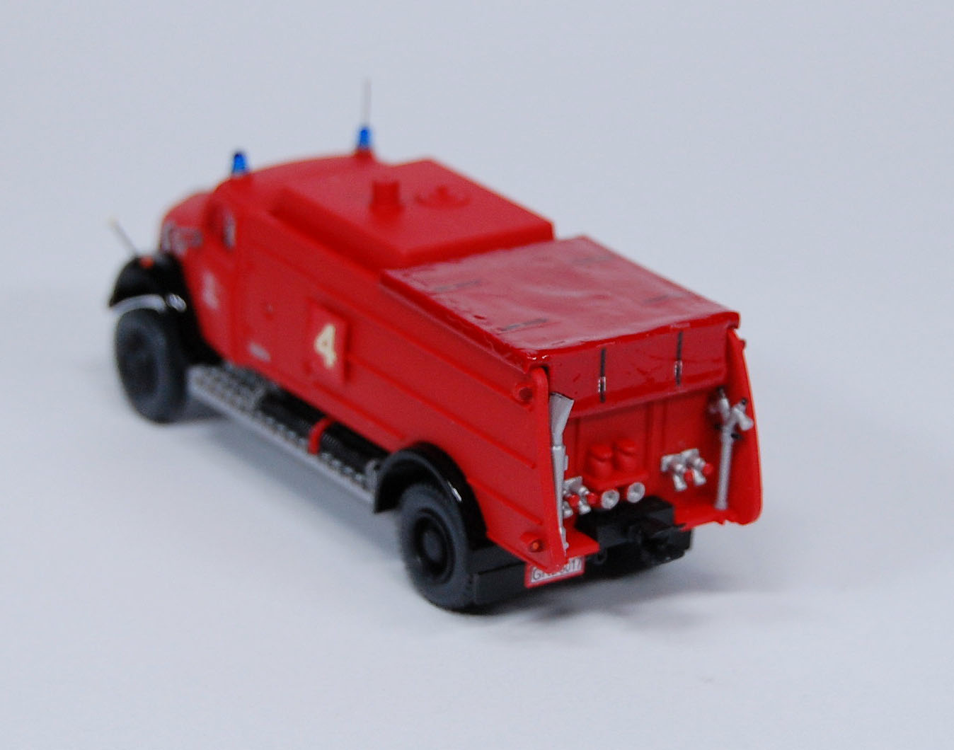 Zum Modell: Hier handelt es sich um die bekannte Kombination von einer Fahrerkabine/Fahrgestell der Fa. Preiser und eines Aufbaues aus dem Hause RMM. Das Modell wurde fast komplett "aus der Schachtel" gebaut und erhielt nur wenige Änderungen. Die bei den Bausätzen beigelegten offenen Trittstufen wurden gegen solche mit Schlauchkästen ausgetauscht. Die sich halb unter der Plane befindliche Schlauchhaspel wurde an den Längsseiten geöffnet und mit Litze umwickelt, mit der man sehr gut formbeständige Druckschläuche nachbilden kann - gleiches gilt für die beiden Angriffseinrichtungen rechts und links. Ein paar Details wie Bodensprühdüsen vorn unter der vorderen Stoßstange, eine Sirene auf dem Kotflügel auf der Fahrerseite, Antenne und Decals vervollständigen das Modell.