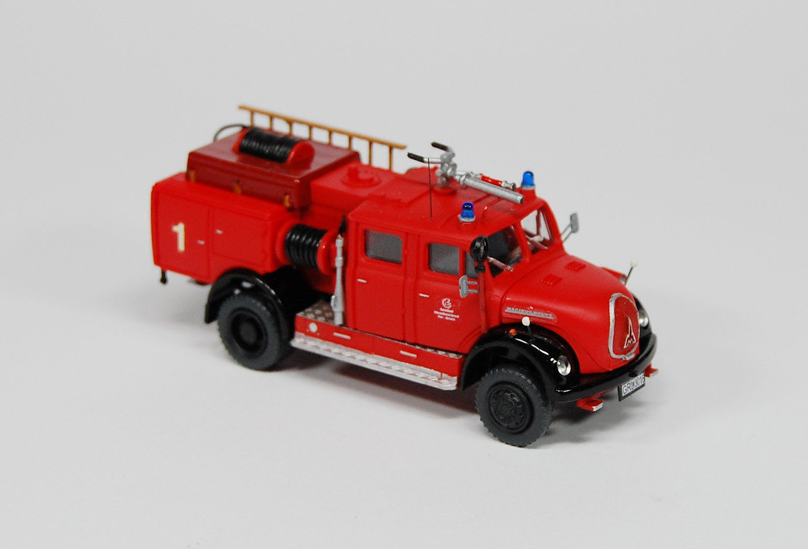 Zum Modell: Den Ausgang bildet hier das Preiser Modell eines ZB und eine beliebige Rundhauber Magirus Fahrerkabine, sowie ein großer Schaummitteltank aus dem Hause RMM. Das Fahrgestell wurde insgesamt um 2mm gekürzt, da mir der Abstand zw. Fahrerkabine/Aufbau zu groß erschien. Die hinteren originalen Kotflügel wurden in der Breite gekürzt, so dass sie die gleiche Breite haben wie die vorderen an der Fahrerkabine. Das Aufbaudach wurde zu 2/3 entfernt und durch eine Platikplatte verschlossen. Vorn wurde der Schaummitteltank angebracht und hinten ebenfalls mittels einer Platte eine Plane nachgebildet (Im Original liegen hierunter Schläuche, die während der Fahrt ausgelegt werden können.). Die Trittstufen entstanden im Eigenbau aus Riffelblech von Preiser/Bastian. Da die Räder des ZB - Bausatzes nun etwas zu überdimensional wirkten, wurden für das Modell neue gefertigt. Sie entstanden aus Wiking - Räder (KW), die aufgebohrt wurden und dann die Original Preiser - Magirus - Felgen erhielt. Hinten wurde noch ein Schaumrohr und ein Standroht montiert. Decals und Farbe vervollständigen das Modell.