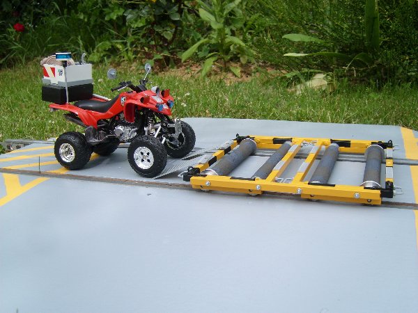 Der Gerätesatz ist zerlegbar und besteht aus 2 Rollenrahmen, 2 Längstraversen, 2 Auffahrbleche sowie einer abgekröpften Kuppelstange für eine Schienenlore. Der Rahmen wird an einem Bahnübergang montiert und das Quad daraufgefahren, schon ist eine Kontrollfahrt möglich. Mittels der Kuppelstange ist auch der Transport der, auf dem RW- Schiene verladenen Schienenlore möglich. Somit können Einsatzgeräte leicht auch an schwer erreichbare Abschnitte transportiert werden.