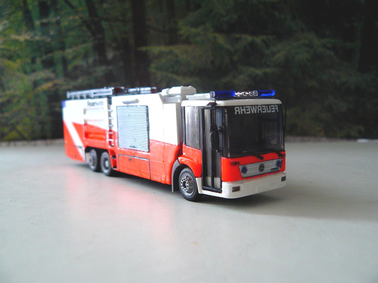 So nach dem der erste Feuerwehr- Econic das zeitliche gesegnet hat, habe ich auf einem Getränke- LKW ein GTLF gebaut. Das hieß: erst FG verlängen und dann den Aufbau zurechtschneiden. Was nich grad einfach war da die Seitenwände sich nach innen bogen. Da ich keine Riffelblechplatte von Kibri hatte , die gross genug war habe ich fürs Dach eine normale Bastelplatte (1mm stark) genommen und ein Decal drauf gemacht. Der Wasserwerfer ist von RMM die Leitern von Rietze. Die Heckwarneinrichtung ist ein Eigenbau. Die Blaulichter sind vorne von Trident und hinten von Busch. Die Ladebordwand am Heck funktioniert wie die von den Doppelstock- Trailern. Er ist übrigens ein reiner Wassertanker.