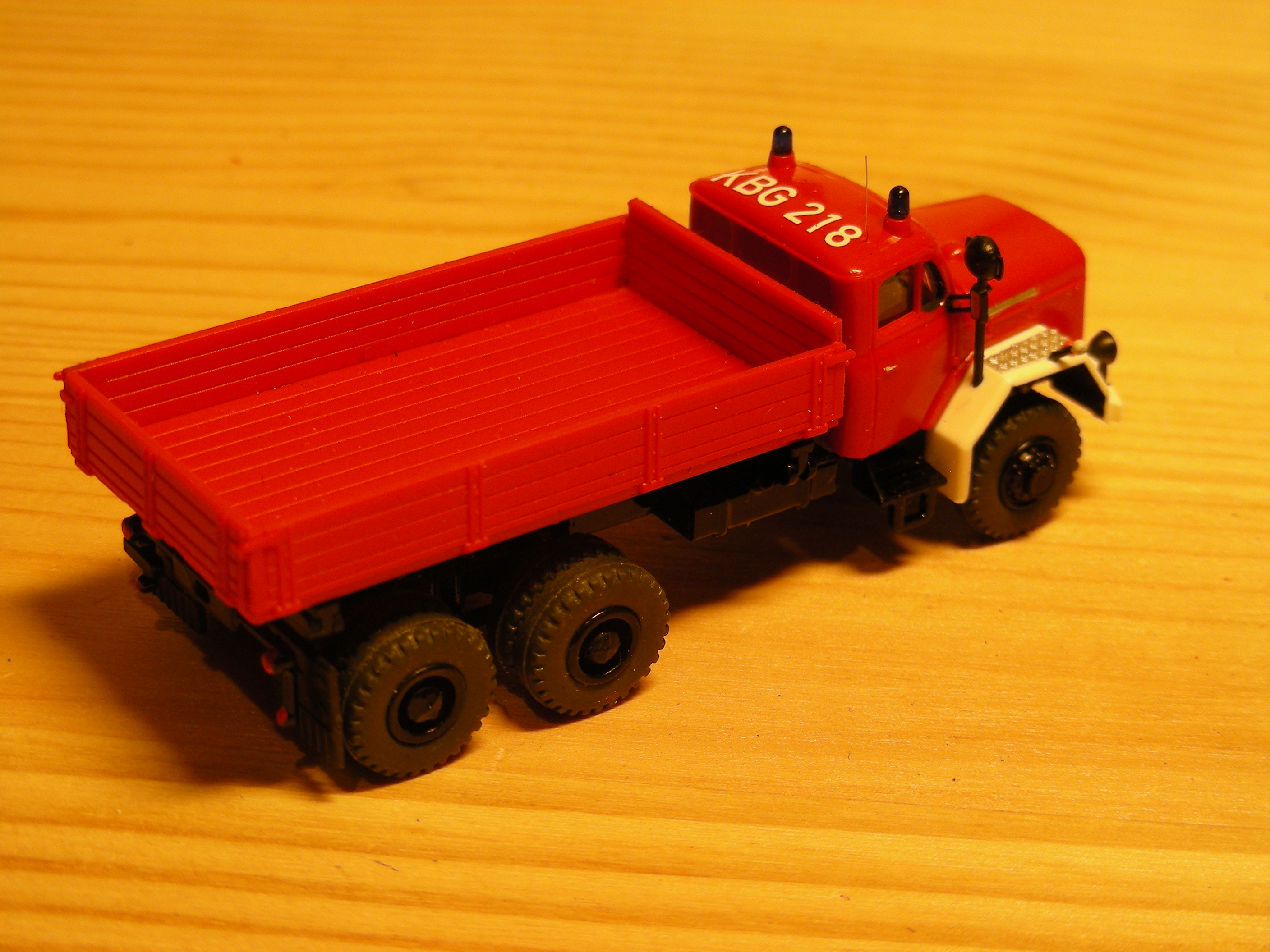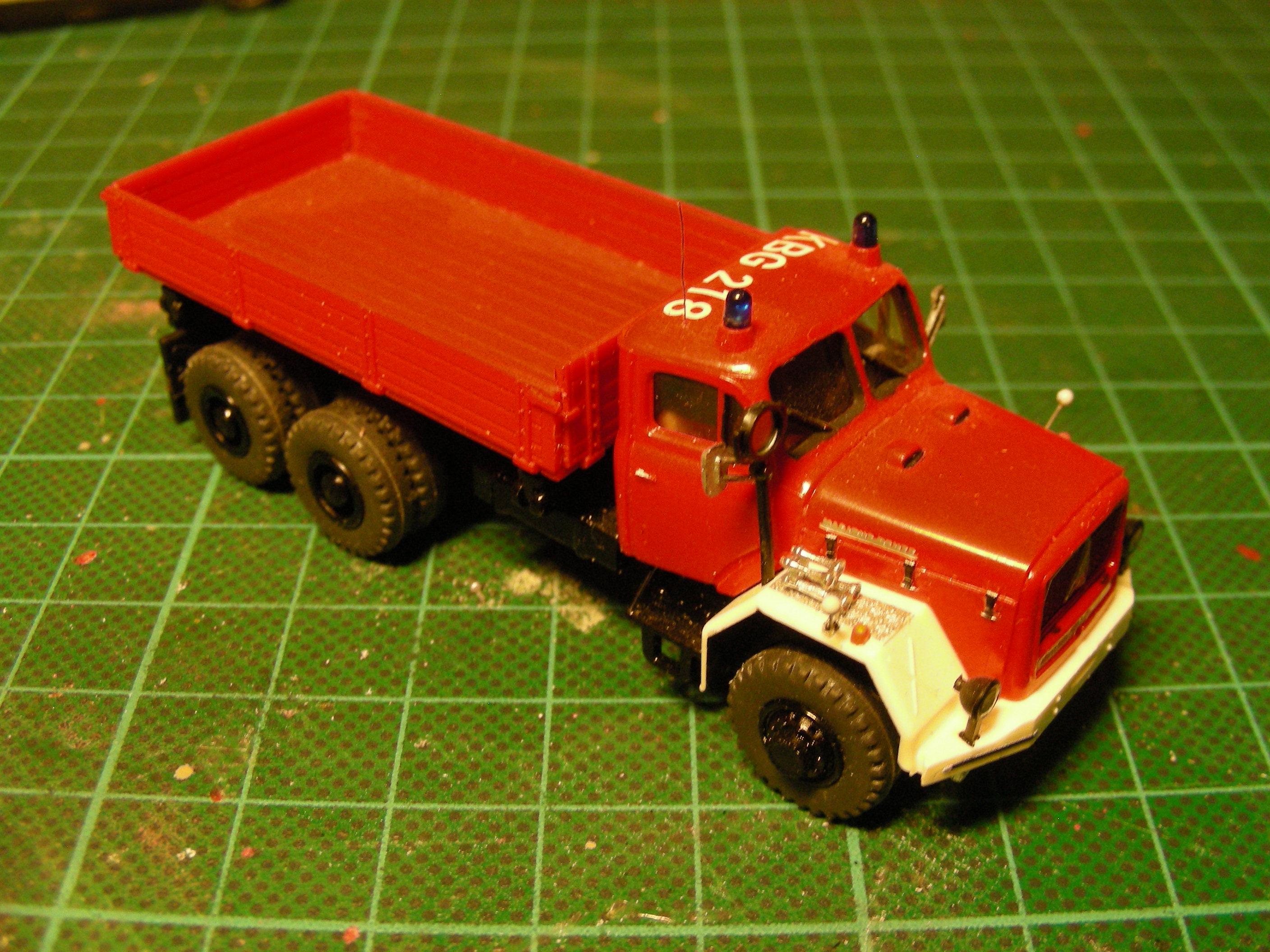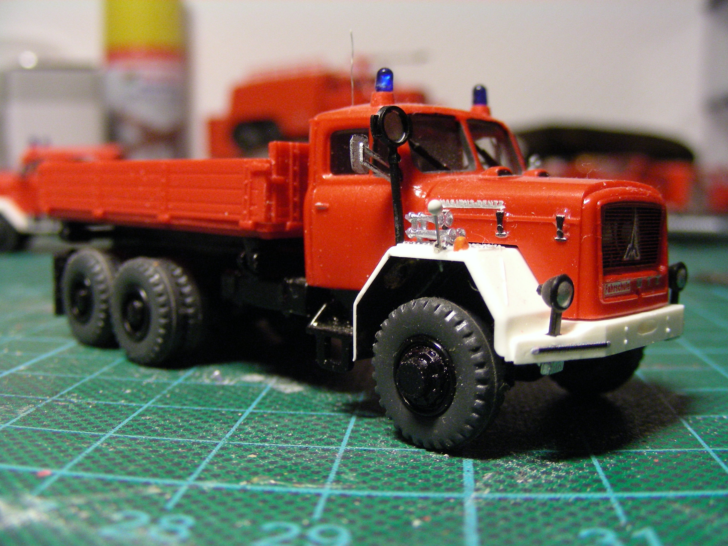 Das Modell basiert auf dem Preiser-Bausatz des 3-achsigen Magirus Dreiseitenkippers. Dieser spendete das Fahrgestell und den roten Kühlergrill. Das Fahrgestell wurde schwarz lackiert. Die Kabine und die Pritsche stammen von einem Bastian-Bausatz eines schweren Magirus Dreiseitenkippers, der aber leider nur ein 2-achs Fahrgestell hatte - und das gefiel mir gar nicht. Aber diese Teile waren alle schon in der richtigen Farbe und die Kabine hatte Blaulichtsockel.