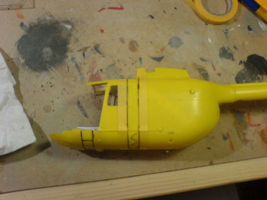 Hier mal ein Bild von den Schnitten die gemacht werden müssen. Man bedenke bitte, dass man für die Verlängerung entweder zwei Modelle der BO105 benötigt, oder Polystyrol - wobei ich hierfür zwei Modelle verwendet habe.