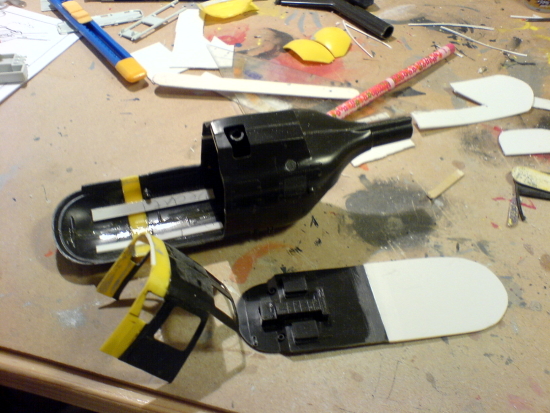 Grüne Linie(n): An diesen Stellen muss später eingefügt werden. Bitte beachten, dass am unteren Teil unbedingt vor dem Loch für's Landegestell (--> blauer Pfeil) eingefügt werden muss, da man sonst noch die Kufen verlängern müsste. Wäre nicht so dramatisch, entspricht aber nicht dem Original - und warum Arbeit machen?