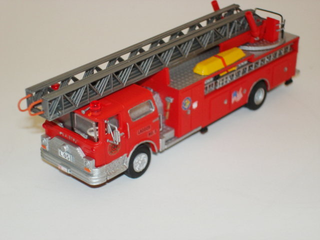 Es gilt das gleiche was ich bereits für die Engine 1 geschrieben habe, so das ich hier nicht noch mal gesondert darauf eingehe. Der eigentliche Umbau betrifft die Leiter samt Aufrichteinheit, diese wurde aus Teilen des IHC - Modells und Teilen der Sattelschlepper - Leiter der Fa. Busch gebaut. Das gesamte Leiterpaket stammt, in Ermangelung einer amerikanischen Leiter, von Herpa und wurde entsprechend angepasst. Hinzu kommen noch zur Detaillierung ein paar Kleinigkeiten wie z.B. Schleifkorb (Roco), Leitern (Brekina und Preiser), Geländer (Draht), Brechstange/-eisen (Ralph Ratcliffe), Spiegel (Roco), Hörner (Busch), RKL`s (Roco) und diverse Teile aus der Bastelkiste. Die Decals stammen wieder von den genannten Herstellern.