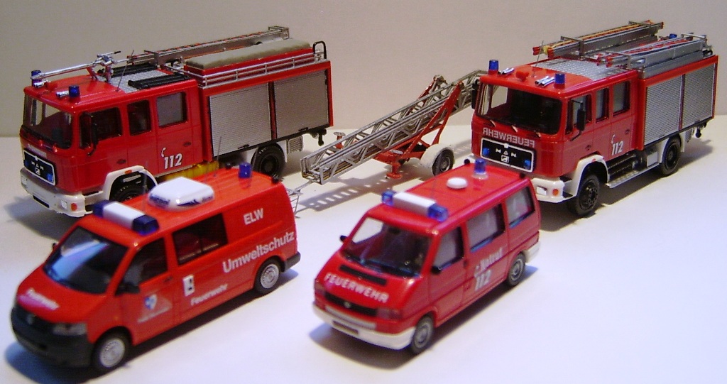 Die Modelle sind alles gesuperte Serienmodelle. Beim TLF wurde Wert auf einen möglichst großen Schaummittelvorrat gelegt (Rechts und Links je 8 Kanister). Türwappen sind schon in der Mache. :wink: