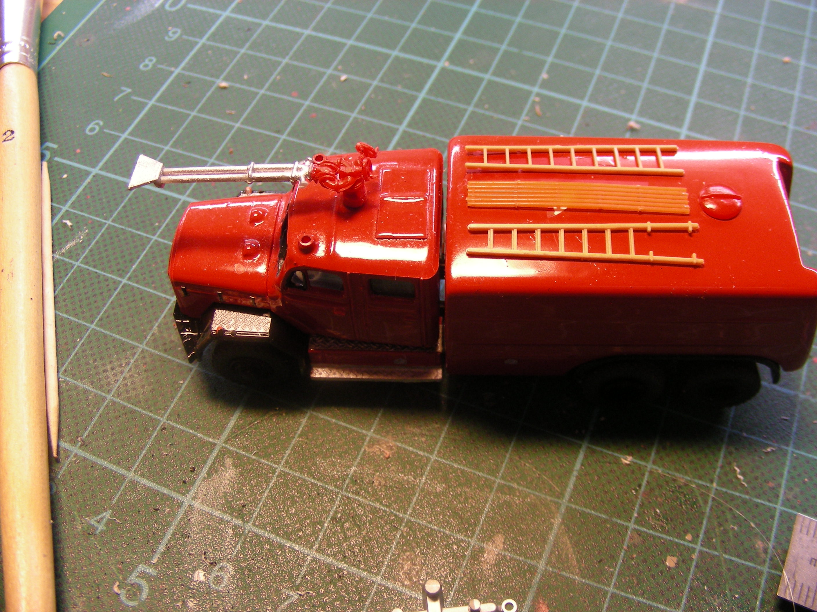 Auf die Kabine wird noch eine Dachklappe (ähnlich dem Rundhauber FLF Flughafen Düsseldorf von Preiser) und ein Werfer gebaut. Am offenen Heck werden noch Ein- und Abgänge für die Pumpe angebaut. Danach soll das Ganze dann lackiert werden...