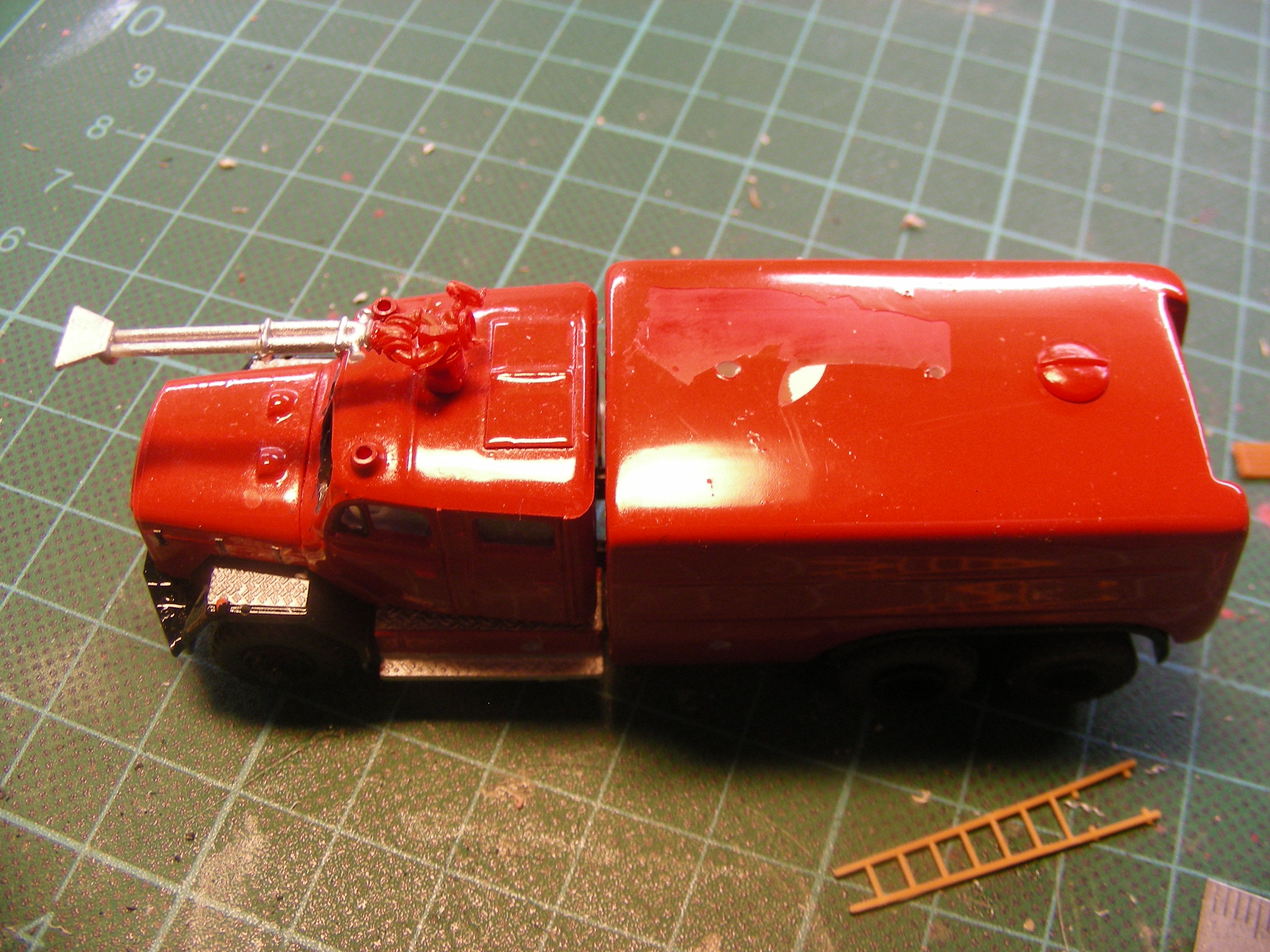 Die erste Stellprobe mit dem noch aufgebauten Dachkasten gefielen mir nicht so recht, denn die Karre sah irre hoch aus. Der Vergleich mit einem RW3-St gab mir dann recht: noch höher als der Rüstwagen. Mir fiel auch nicht so recht was vernünftiges für die Beladung in dem Dachkasten ein - hatte zuerst an B-Schläuche in Buchten zur Wasserversorgung gedacht. Aber die hätten dann wohl alles "kapputtgeschlagen" beim Verlegen. Also kam der Gedanke auf: wieso überhaupt eine Dachbeladung beim GTLF? Der bringt doch eh nur Wasser mit. Also habe ich den Dachkasten abgeschnitten, das dann sich aufreissende Loch mit Plastikplatten aufgefüllt, gefeilt, geschliffen, gespachtelt, gefeilt, geschliffen, gespachtelt, gefeilt, geschliffen bis zum jetztigen Endstand.
