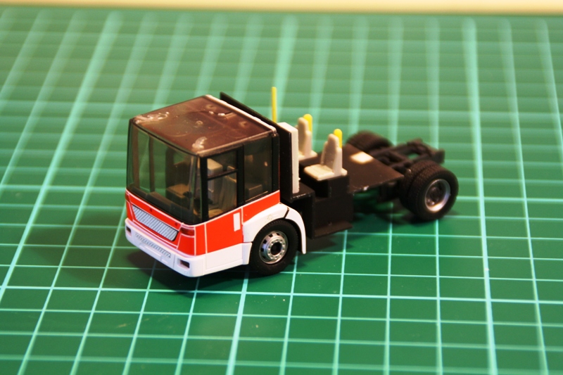 Zum Modell: Wie schon gesagt, der Aufbau samt Integralkabine wurde aus PS-Platten und Profilen erstellt. Aber auch bei der farblichen Gestaltung ging ich einen anderen Weg. Diesmal hab ich die weißen Flächen nicht abgeklebt, sondern alles tagesleuchtrot lackiert. Die weißen Streifen der Folienoptik entstanden dann aus Decalstreifen.